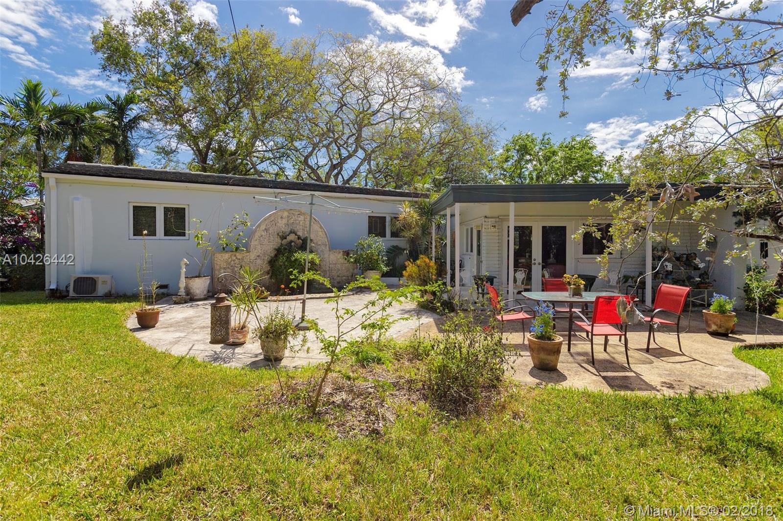 BEAUTIFUL CORNER LOT IN MIAMI SHORES, WALK TO THE COUNTRY CLUB AND GOLF COURSE. WALKING DISTANCE TO THE COMMUNITY CENTER AND OTHER ACTIVITIES IN MIAMI SHORES. 2 BEDROOMS AND 2 FULL BATHS. ENTRY FOYER, LARGE EAT-IN KITCHEN. LIVING ROOM HAS ORIGINAL FIRE PLACE AND IS OPEN TO THE FAMILY ROOM. FAMILY ROOM HAS VIEW TO THE GARDEN. BIG YARD WITH BEAUTIFUL FOUNTAIN AND ROOM FOR A POOL. ATTACHED ONE CAR GARAGE, NEWER ROOF, IMPACT WINDOWS.
