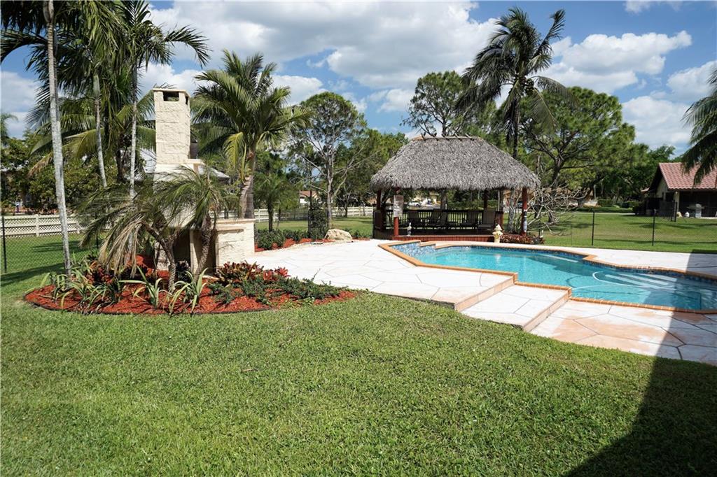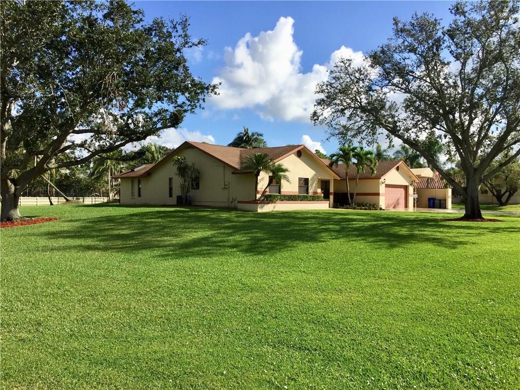Ranch style home sitting on over an acre of lush green grass, large oak trees, and palms.Home located in the prestigious “Ivanhoe Estates” neighborhood in South West Ranches. House is on a quiet dead end cul-du-sac street. Over 2400 sq ft under air. A 3000 sq ft concrete driveway to park motorhome/boat.House has impact windows throughout.Roofed covered patio lanai including a wet bar.Granite and wood cabinets throughout kitchen and baths.2 stone fireplaces. To more features to list. A must see property.
