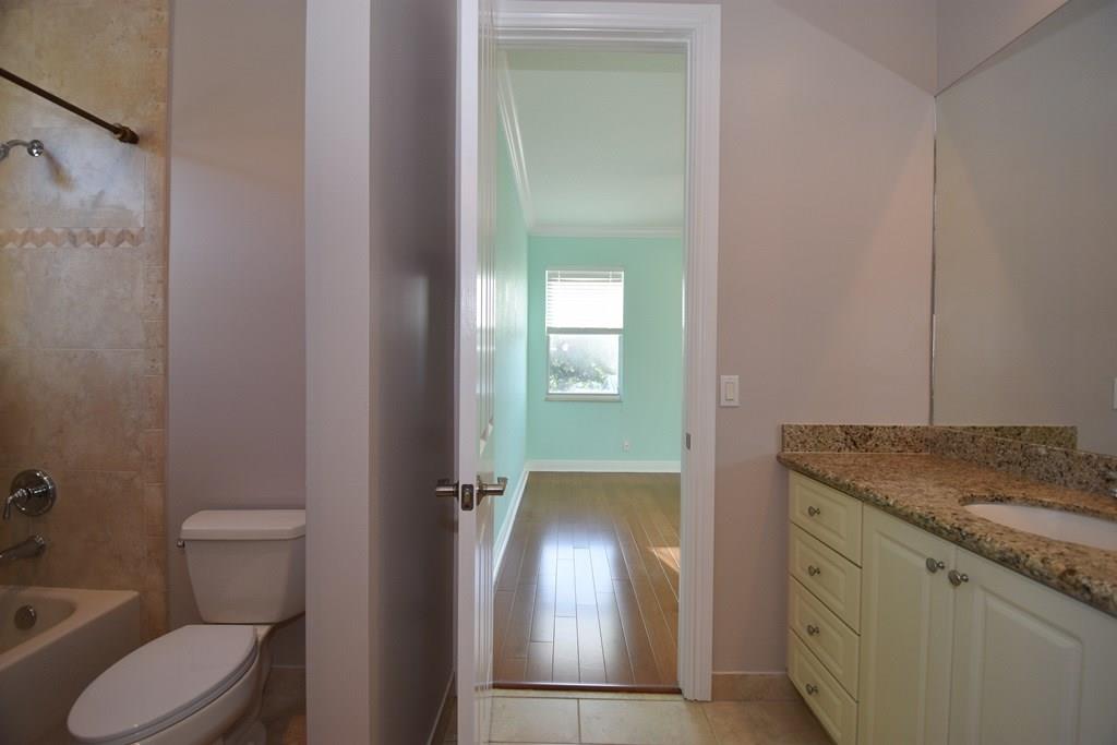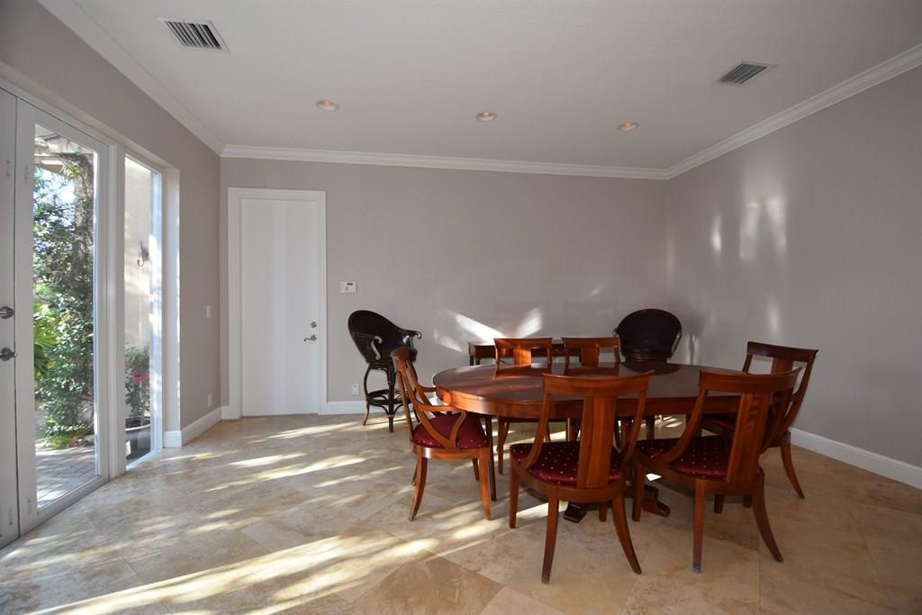 Gorgeous V Park townhome w/courtyard entry. Unique layout w/ downstairs Master Bedroom. Pool view from Kitchen, Dining & Master Bedroom! Walk into the lushly landscaped pool & patio area through the grand double door entrance. Interior features incl Travertine marble & wood floors, huge kitchen w/ custom pullout cabinets & stainless appliances, downstairs Master, closet cabinetry,laundry rm w/sink, crown molding, central vac & 2nd fl open balcony. Mosquito system, impact windows & low voltage lighting.