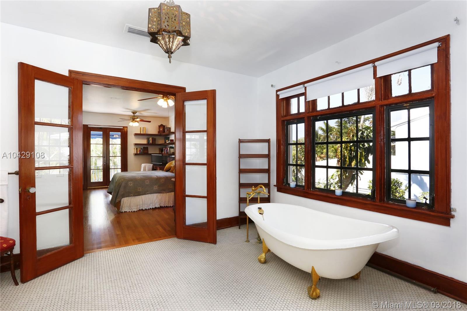 Timeless Mediterranean Villa with elegant Moroccan details on a corner half acre. Courtyard entry to the light filled sunroom with arched windows and fountain. Beautiful living room with high beamed ceilings, carved fireplace and adjoining dining room. Staircase with wood scrollwork leads you upstairs. Master suite with fireplace, wood floors, & private terrace with fountain overlooking the pool. Carriage house for guests nested among the award-winning Andalusian garden with pond, gazebo and fountain. Designed by acclaimed pioneering architect Martin Luther Hampton.