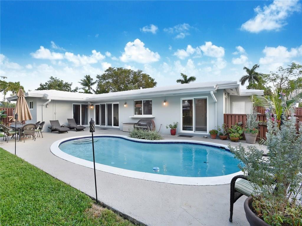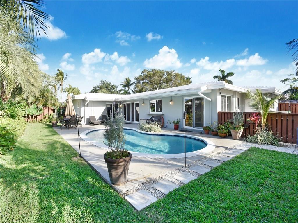 Stunning, tastefully renovated Imperial Point pool home! Gleaming wood floors throughout, chic tile work in both bathrooms, open kitchen with plenty of cabinet space, neutral granite countertops & stainless steel appliances. Spacious master suite opens to the patio. Enjoy the large backyard complete w/ patio & pool - perfect for entertaining! Situated on a lushly landscaped, fenced corner lot. Indoor utility room located off the kitchen. Impact doors & windows. Circular driveway provides extra parking.