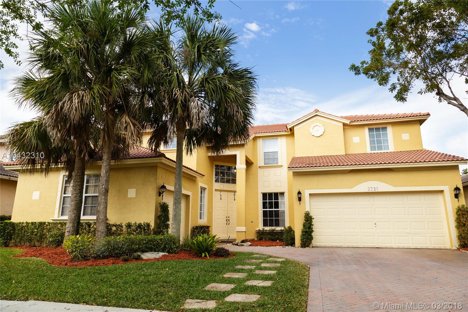 Custom Gardenia model, 5 bedrooms, 3 baths and a half, upgraded lot in the prestigious Isles at Weston. Double door entry with high cellings, formal living and dining areas open to the family room. Spacious kitchen with stainless steel appliances, 42’ kitchen cabinets, breakfast areas. Hardwood floors and crown molding throughout the house, upgraded light ceiling package in living areas, guest bedroom downstairs with full bath, garage with custom storage closets and extra freezer. Surround speaker system, French doors, extended brick patio with plenty of room for a pool with a convenient cabana bath. This house is perfect for entertaining and family gatherings. Community Club House with 2 pools, gym, party areas, volleyball & basketball court, playground and more.