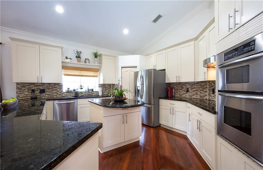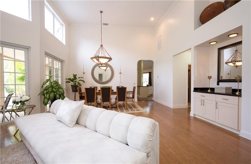 GORGEOUS ONE STORY HOME IN GUARD GATED COMMUNITY! YOU WILL BE AMAZED WITH THE SOARING CEILINGS, BRIGHT & OPEN W/NATURAL LIGHT. GOURMET KITCHEN WITH GRANITE COUNTERTOPS, SS APPLIANCES, CENTER ISLAND & LARGE SNACK BAR. GORGEOUS WOOD FLOORING IN THE MAIN LIVING AREAS. MASTER FEATURES TRAVERTINE FLOORING, UPDATED BATH W/FRAMELESS SHOWER. FRENCH DOORS LEAD OUT TO FENCED IN HUGE BACKYARD W/COVERED SITTING AREA & OVERSIZED SALT WATER POOL. HOME IS LOCATED ON QUIET STREET W/NO THRU TRAFFIC. ROOF IS 5 YEARS OLD.