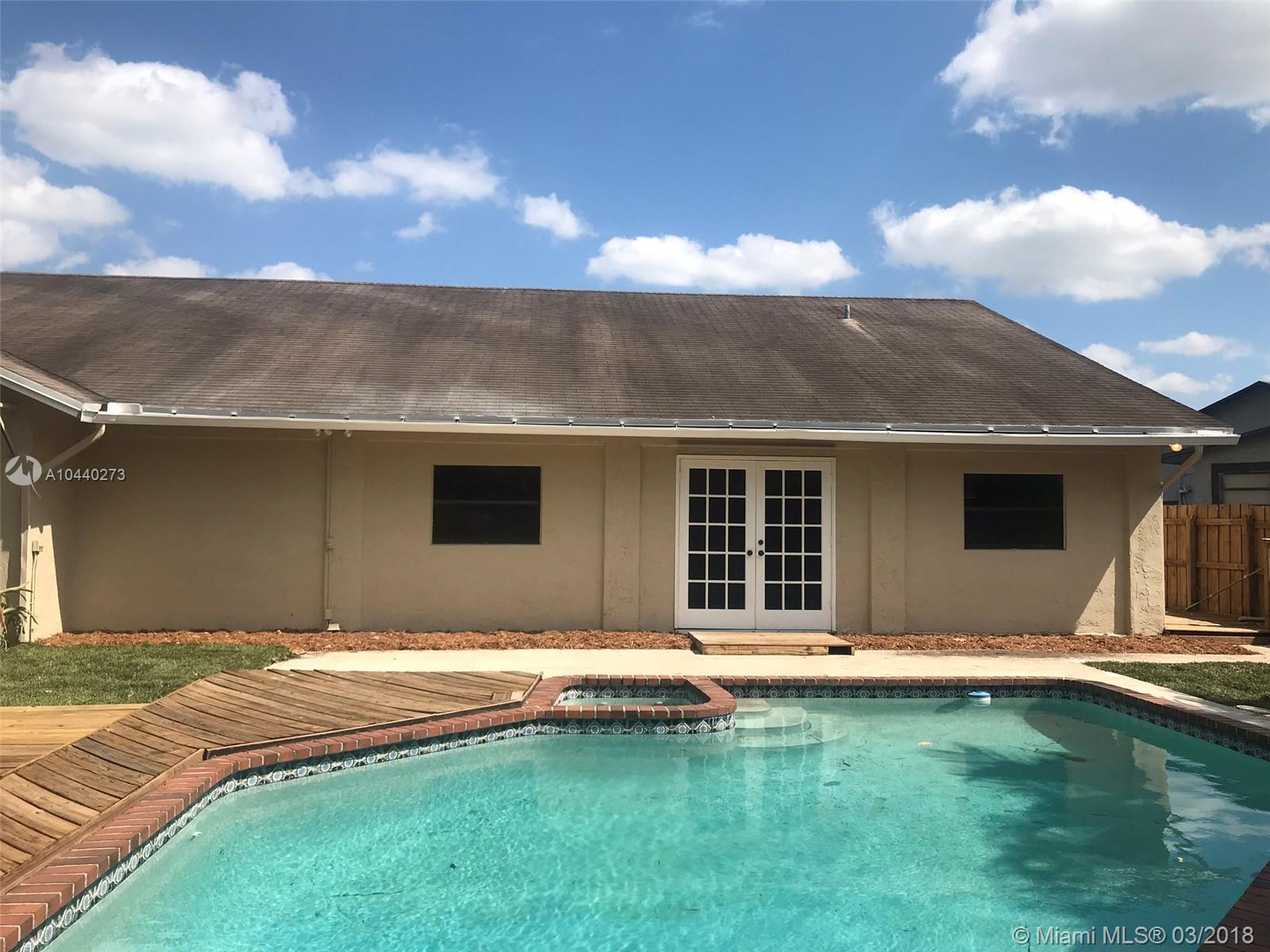 This three bedroom, two bath pool & spa home, sits on a cul de sac. It features an Italian front door, vaulted wood ceilings, Mexican tile and laminate floors, french doors, custom bathrooms, a utility room and a two car garage. The eat in kitchen has a cooking island and granite counters. The spacious family room has a wet bar, it allows for a possible forth bedroom and still provides ample space for the family. Your private back yard oasis offers plenty of room for entertaining, a covered grilling, covered lounging area and a side grassy area for family fun. Freshly painted inside and out. This house sits in the heart of Pembroke Pines, very close to the new City Center featuring restaurants, entertainment, shops and a Publix. Close proximity to schools and hospital. No association