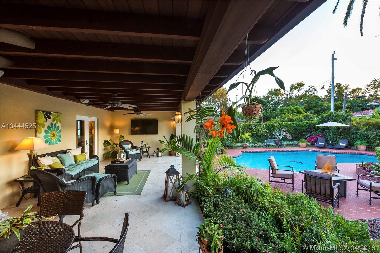 1938 Deco one-story home which sits on an 18,000+ sqft lot with luscious landscaping surrounding it. This property is located in the heart of the Golden Triangle. Immaculate 3-bedroom, 3-bath split-plan. Completely updated with impact windows and doors, a working wood burning fireplace, surround sound system, Thomasville kitchen cabinetry with stainless-steel appliances and granite countertops, 2-car garage, generator and a huge laundry room. With a large covered terrace with built in barbeque, one can relax after a swim in the wonderfully heated pool. In fact, from the terrace, and especially at night, you get the feeling of being in a country home, that lends itself to entertaining.