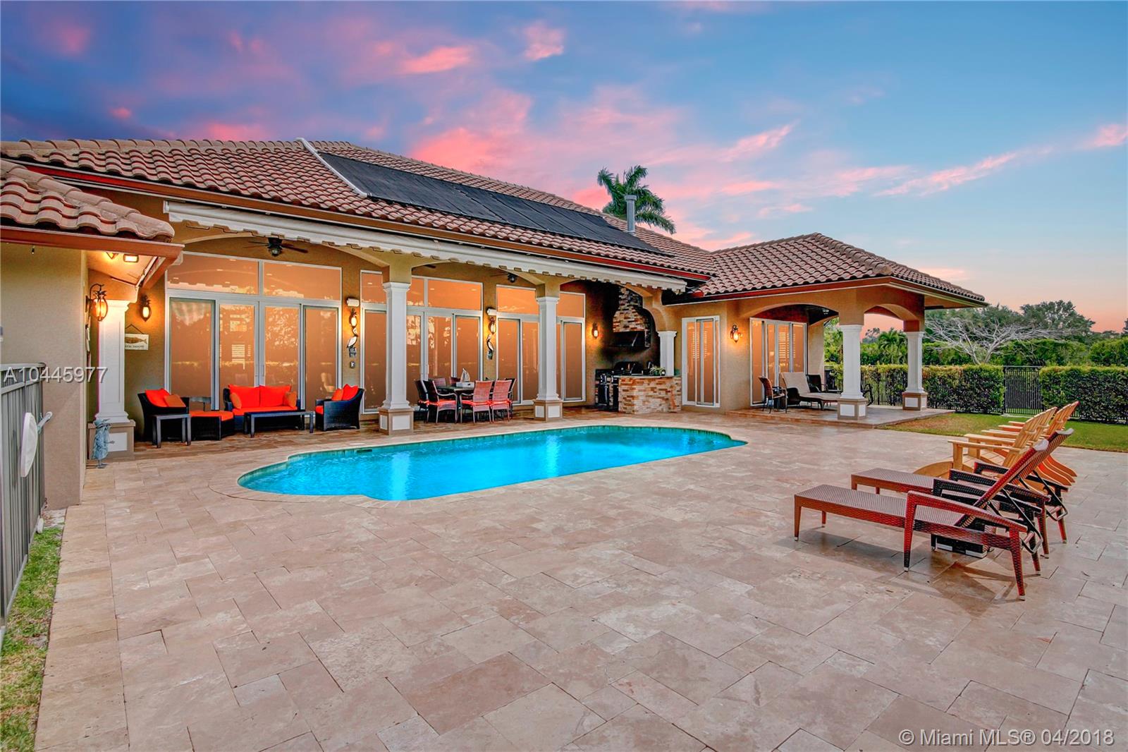 New House Rebuilt in 2010, on almost 1 acre, pie-shaped cul de sac lakefront lot. Modern Split Floor Plan, Tall ceilings, Designed as a huge great room w/ the oversized kitchen as the focal point and living , dining, family rooms all in as one open space w/ porcelain floors, with all Impact windows and Sliding Doors to the Travertine Private Pool Deck w/Full Summer Kitchen, mosquito mister. Circular Driveway. Home Warranty included, Appraised, Inspected. 5th bed is Large Office. “Reduced $40K below appraised value”.
