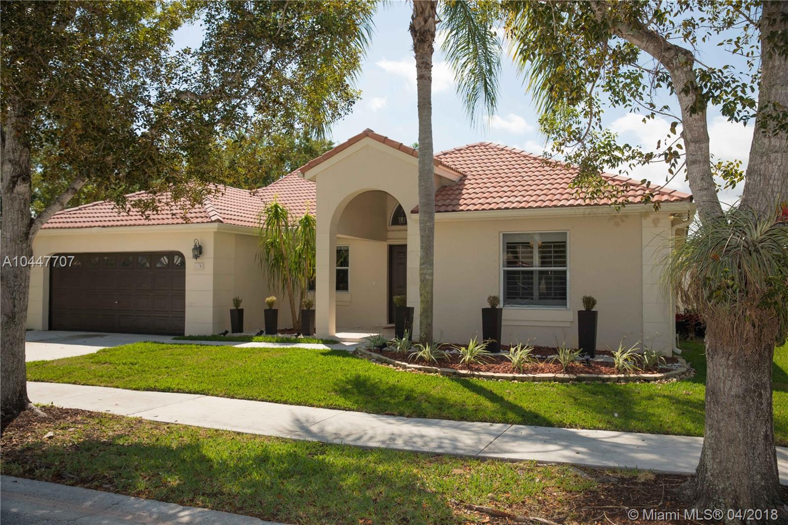IMPECCABLE DESIGNED 5 BEDROOM AND 2.5 BATH HOME VERY WELL MAINTAINED. MARBLE THROUGHOUT LIVING AREA. BEAUTIFUL DARK WOOD FLOORS IN BEDROOMS. CUARZO COUNTERTOP IN KITCHEN WITH JACUZZI, TUB IN MASTER-BATH, BOTH BATHROOM JUST REDONE, HIGH END BLINDS. SIT OUT ON THE COVERED PATIO OVERLOOKING THE NEW SALT POOL WITH SPA. CORNER LOT. ROOF JUST PRESSURE CLEANED. GREAT LOCATION CLOSE TO SUPERMARKETS AND SAWGRASS EXPRESSWAY THE LAKES AMENITIES INCLUDE COMMUNITY POOL, PLAYGROUND, SOCCER FIELD, GUARD GATE. BEST SCHOOLS ALL A RATED.