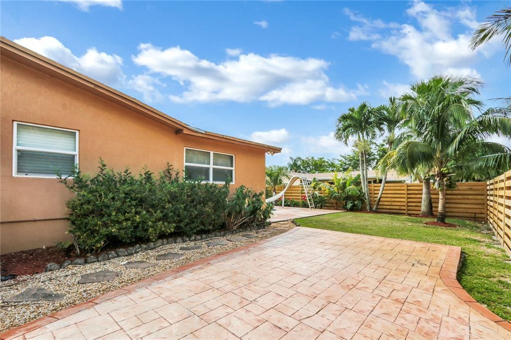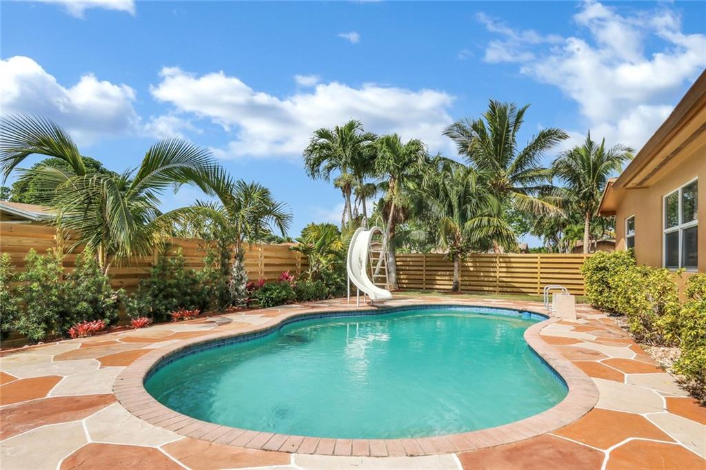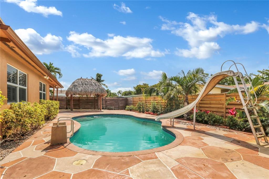 Amazing 4 bed/ 2 bath house w/ 2 car garage. Completely renovated w/ impact windows & doors, kitchen w/ custom cabinets, stainless steel appliances, wine cooler & granite counters, built in bar with subway tile in the dining area, porcelain tile floors in living area & wood in the bedrooms. Crown molding, 5" baseboards, tankless H2O heater. Tropical back yard has heated pool with slide, tiki hut, completely fenced large corner lot with room for a boat or trailer. Priced to sell, don't miss this one!
