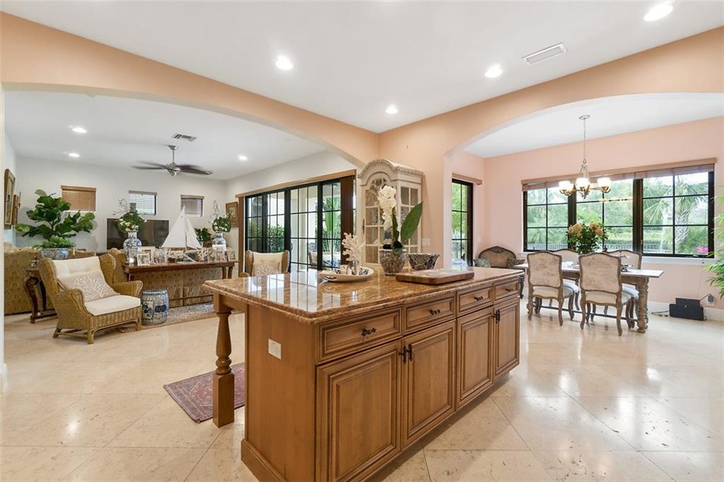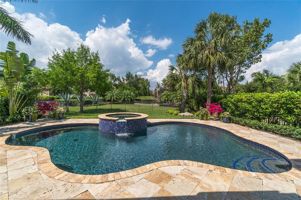The European Charm Starts Before you Enter the Home! Meticulously Trimmed Vines & Landscape Create a Captivating Exterior! The Beautiful Interior is Light & Airy with Soft Natural Light via Soaring Windows! The Kitchen is Stunning with Creamy Cabinetry, Contrasting Wood Island, Fabulous Granite, SS Appliances & Serene Views of the Resort Style Pool/Spa Area! A Large Green Space Showcasing a Very Impressive Stone Fountain Separates the Home from its Rear Neighbor Creating a Tranquil & Private Oasis!
