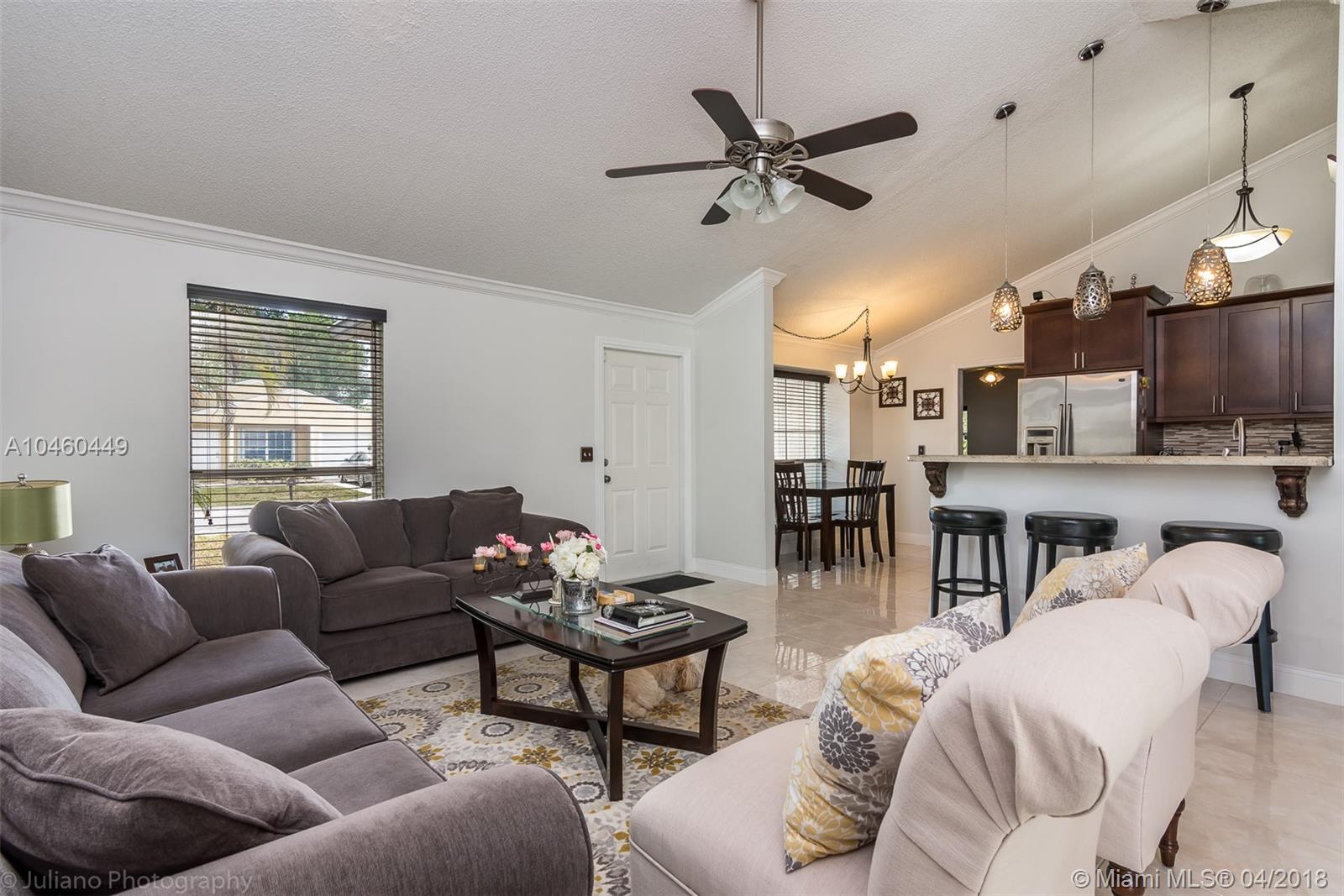 Beautifully updated 2/2 with bonus room in the quiet, low HOA community of Country Park.This home features a completely remodeled kitchen with tall solid plywood maple cabinets and granite countertop; crown molding throughout the common living areas; 6" tall baseboards throughout the entire home; fully renovated Master and Guest Bedrooms, featuring ceramic plank floors, white wooden closet doors, and extra closet shelving; new screens on the enclosed porch; Accordion shutters throughout the entire home and hurricane fabric for the garage door,you may receive full Insurance credits for opening protection; newer water heater replaced in 2012; well maintained A/C replaced in 2011;sensors on all windows and doors for alarm monitoring with ADT;and full privacy hedge along the entire back yard!