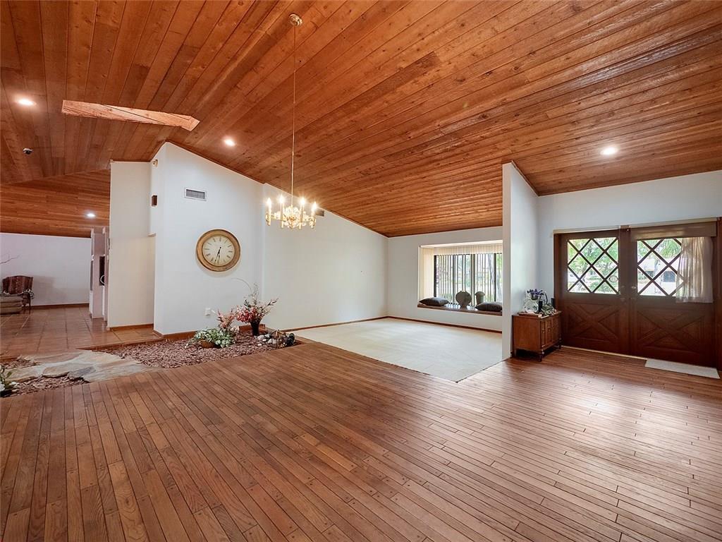 Extremely spacious, this 3 bed, 2.5 bath home sits on more than an acre lot in the sought after community of Pine Tree Estates in Parkland. Home features volume cedar wood ceilings lined with led lights, fireplace, plantation shutters, circular driveway with a 2 car garage, screened patio, huge pool and more. The endless backyard is perfect for entertaining and spacious enough for a guest house. This amazing home is nestled a short distance away from wonderful restaurants, movie theaters, shopping & more.