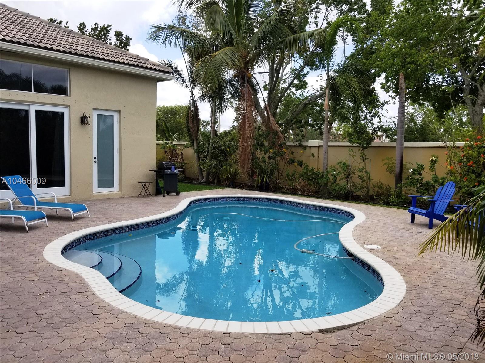 Beautifully appointed home in Pembroke Shores Estates. Dramatic volume ceilings and an open living room that leads into the open concept dining, kitchen and family room. This 4 bed, 3 bath, 3 car garage home has 24 x 24 Porcelain tile in all living areas with hardwood floors in the bedrooms & solid stained Italian doors throughout. The large covered patio has a pavered deck with ample room to sun by the saltwater chlorine generated pool. Maintenance is super low and includes basic cable and 24 hr security & tot lots. This beauty will sell quickly.