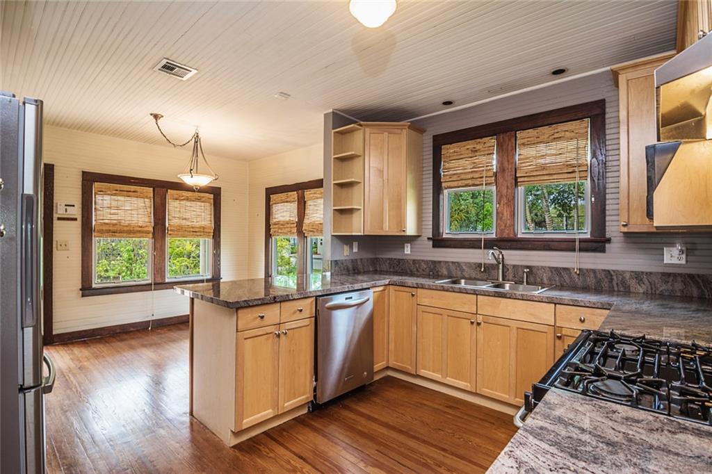 STUNNING Classic Old Pompano home! Restored & thoughtfully upgraded w original Dade Pine floors. Spectacular Chef's Kitchen upgraded w stainless appliances & granite counters. Hurricane Impact windows 2014 w gable shutters. Hurricane code concrete garage. Tankless gas water-heater, Brick Fireplace (gas) House alarm/Video security; Hard wired smoke detector. A/C 2012, Roof 2005. Park your boat or RV; ample driveway. Quarter-acre lot. Rainwater collection system. Corner lot amid serene Native landscaping.