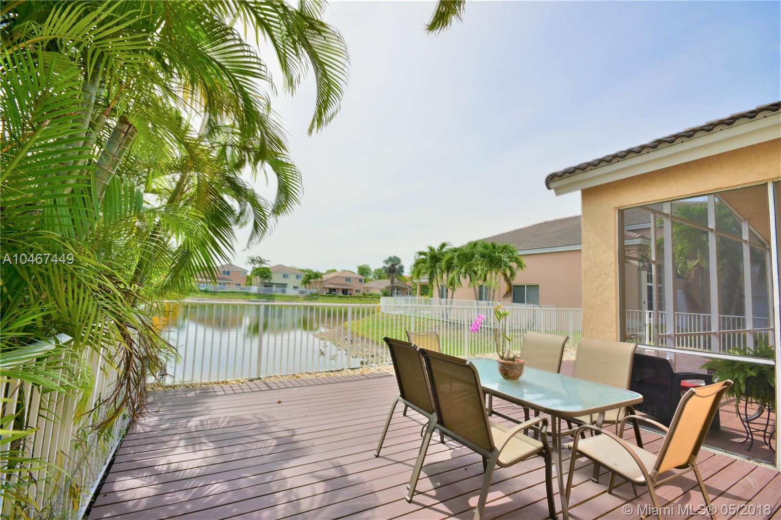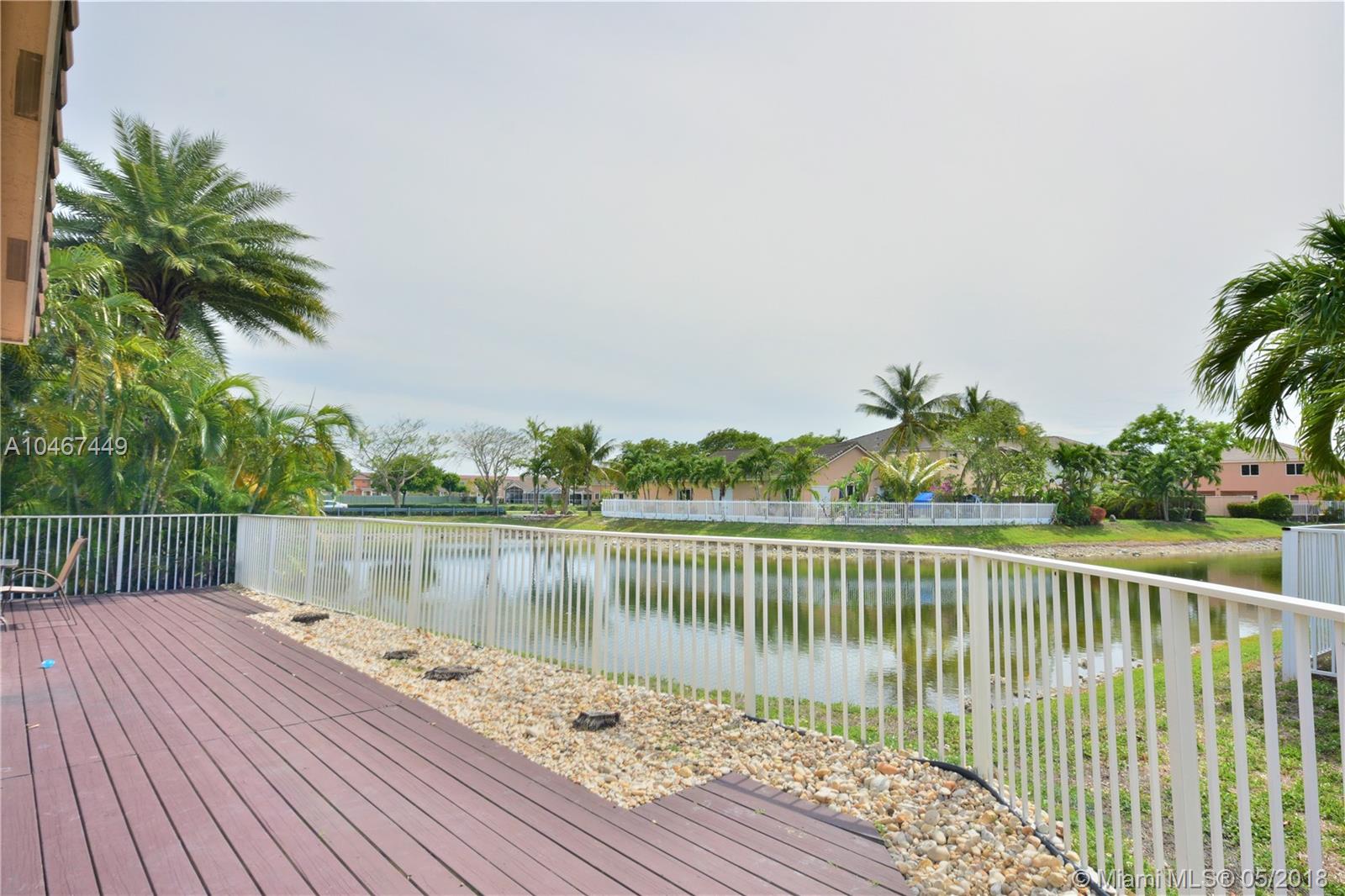 Beautiful and quiet 1 Story lake front residence in the Gated Community of Doral Gardens. This property features 4 Bedrooms & 2 Bathrooms, up dated Kitchen w/Granite counter tops & S/S appliances. Breakfast area. Tiles floor throughout common areas and Hardwood floor in bedrooms. Backyard with ample view of the lake. Screened porch with Wood deck. 2 car garage, home is located on a private Cul de Sac. Walking distance to A+ school. Very low maintenance, HOA includes basic cable and alarm system. Accordion shutters. A MUST SEE !!!!