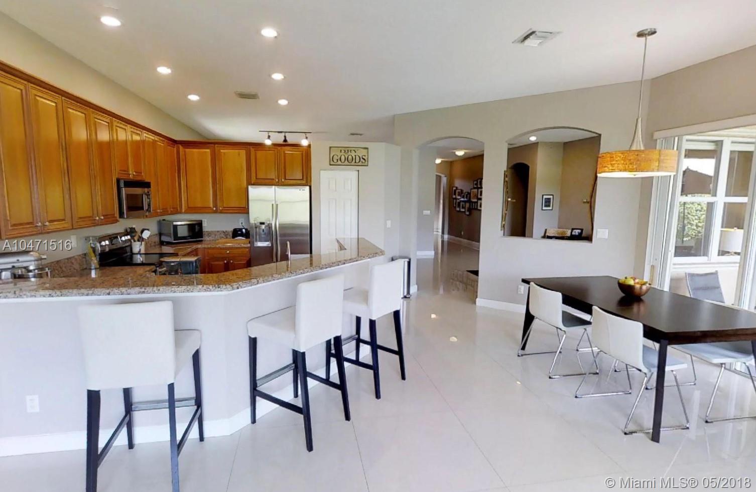 Upgraded, move-in-ready, beautiful 4 bedroom, 3 bathroom home with a 2 car garage in the Isles At Weston. Generous space, painted in neutral colors with rectified porcelain tile throughout living area and laminate wood floors in bedrooms. Updated kitchen with granite countertops and stainless steel appliances. From the family room you have partial view to the lake. Master bedroom looks over the patio and it’s large enough to have a sitting area. The master bathroom has marble floors, a separate shower and tub and double sinks. All closets have built-ins. Secondary bathrooms completely upgraded. Private fenced in backyard with manicured hedges for added privacy. The community fees include Basic cable, internet and alarm monitoring, resort style pool, Gym and more!