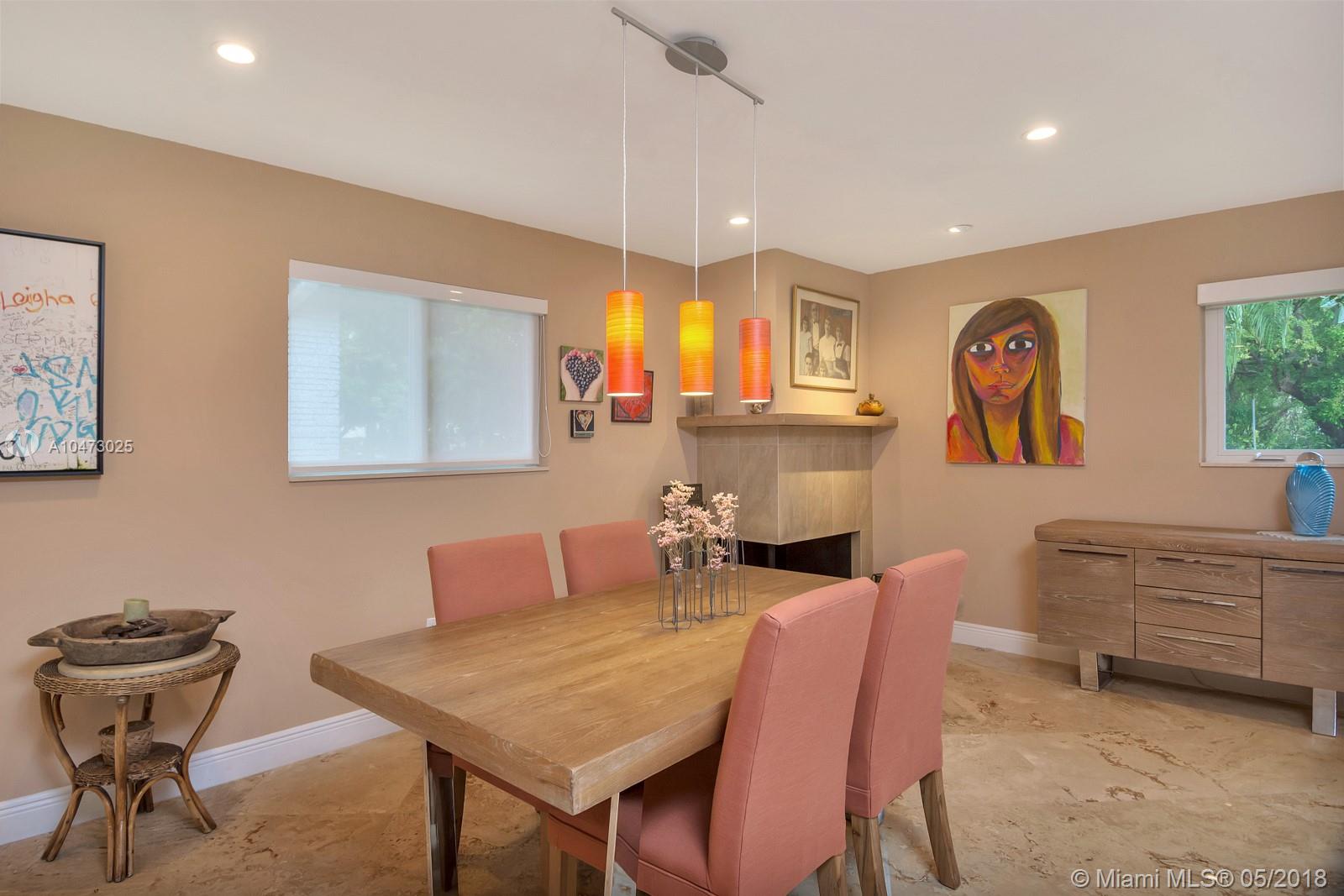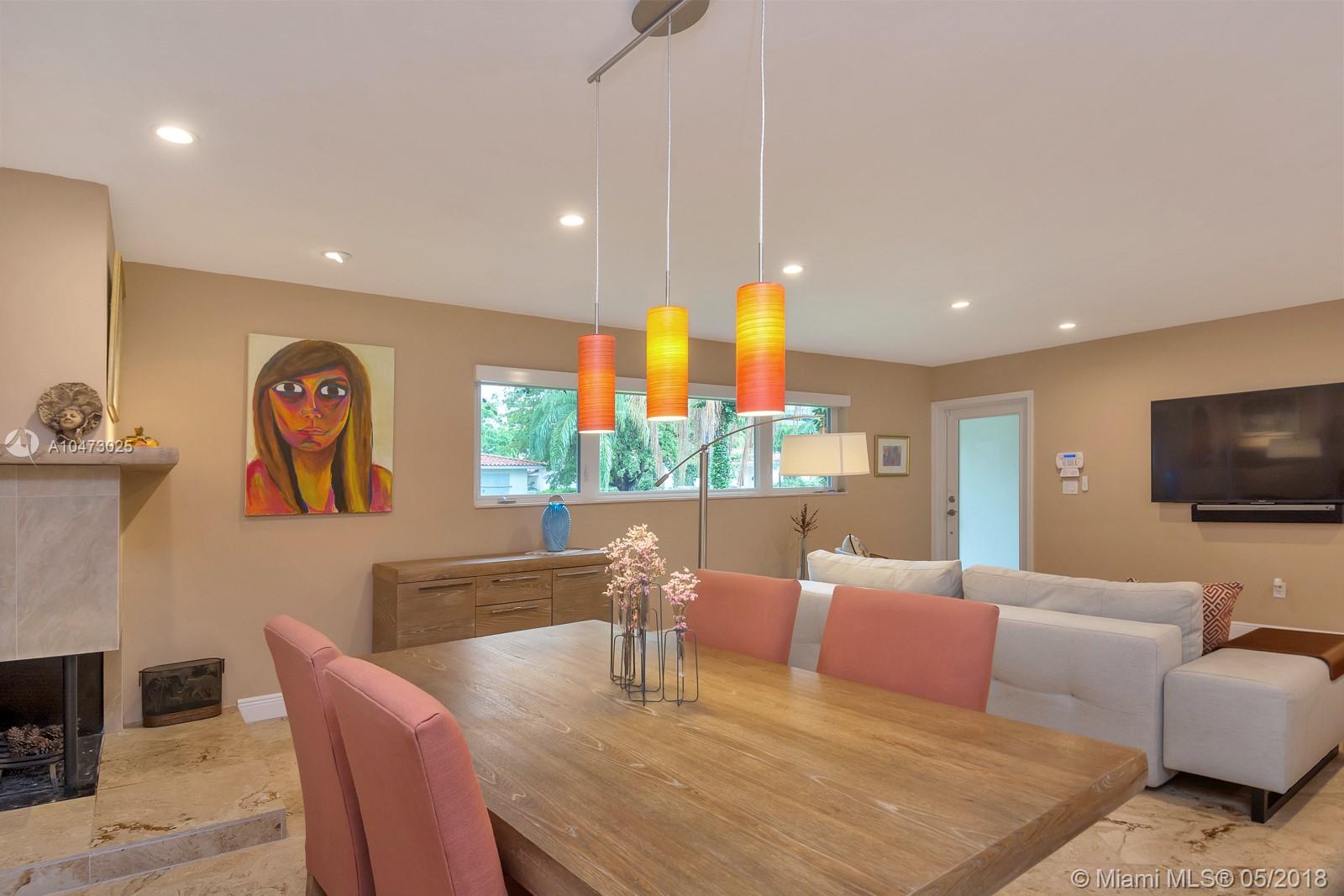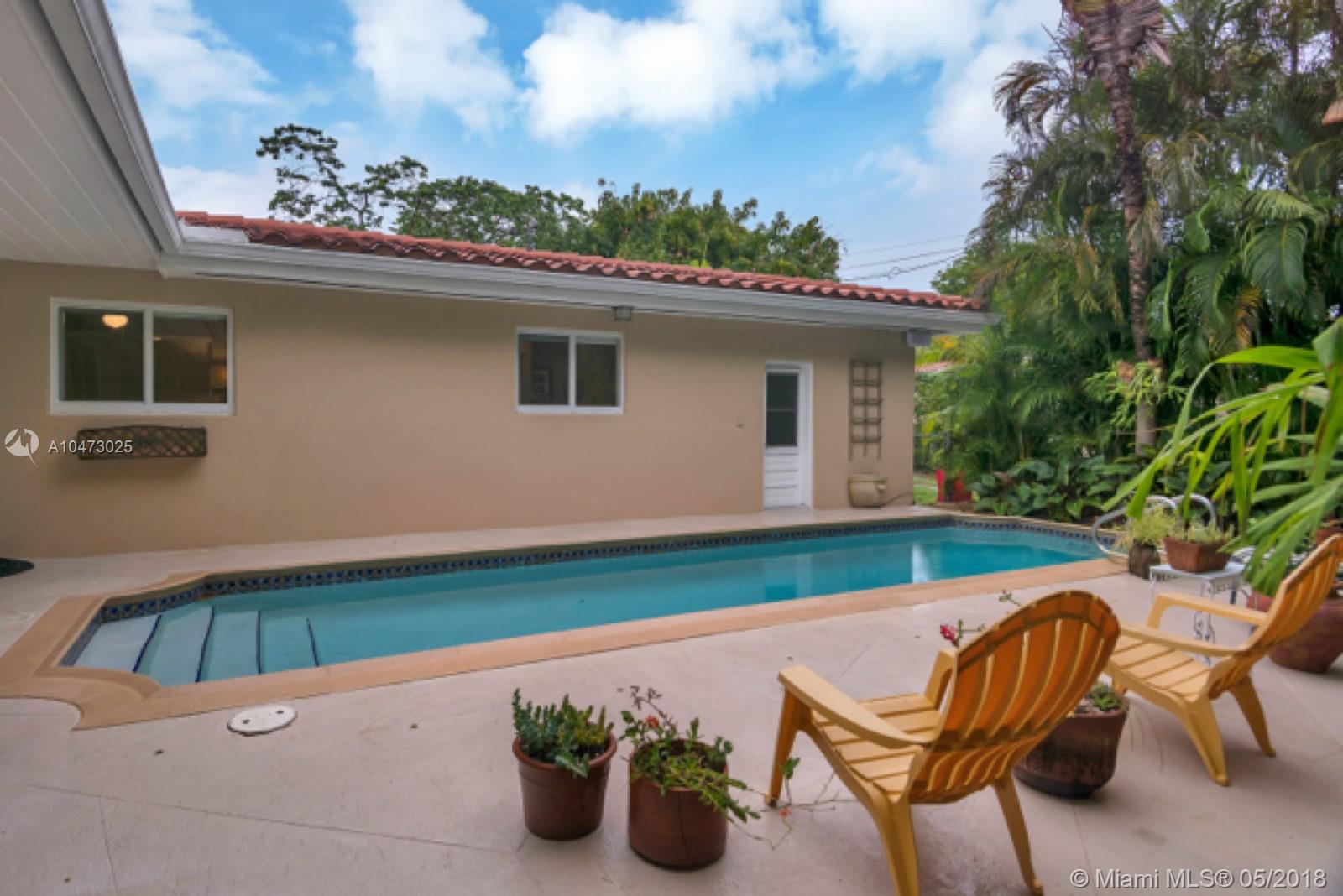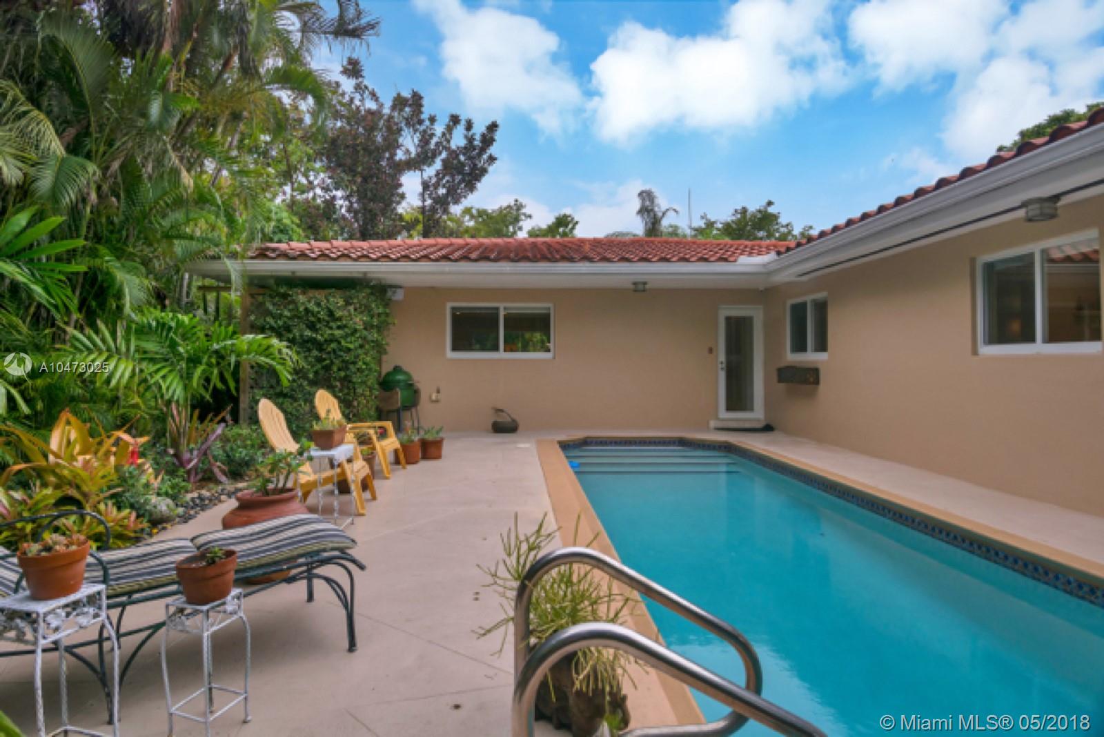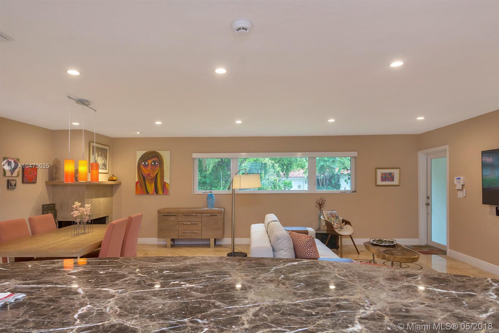 Beautiful property located in the heart of Gables with walking distance to Miracle Mile's restaurants and shops. Recently remodeled home with an open living/dining area and a fireplace. Spacious open floor kitchen with a soothing view of its patio and pool, great for entertaining. Impact windows, surveillance system, automatic sprinkler system are included. The garage does not fit a car, currently being used as storage. Don't miss this opportunity to own this wonderful home!