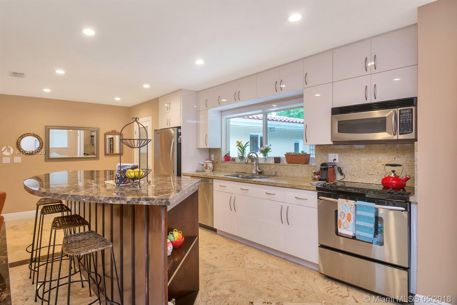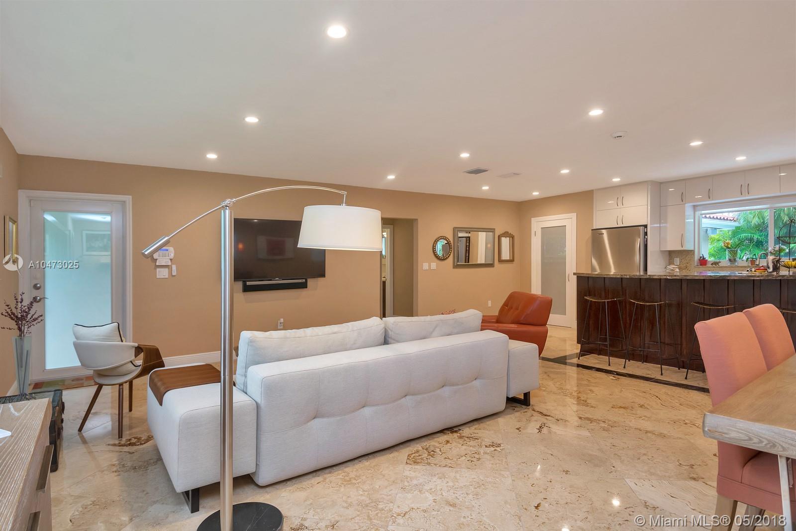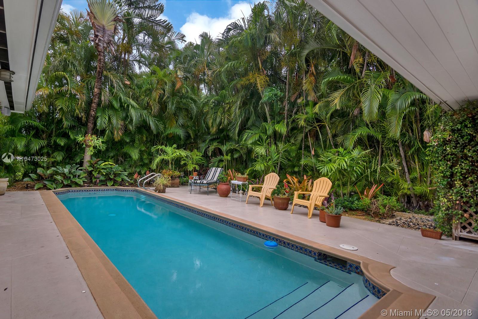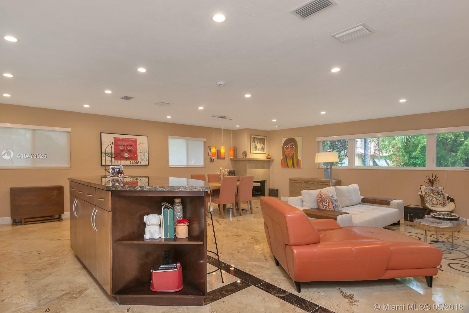 Beautiful property located in the heart of Gables with walking distance to Miracle Mile's restaurants and shops. Recently remodeled home with an open living/dining area and a fireplace. Spacious open floor kitchen with a soothing view of its patio and pool, great for entertaining. Impact windows, surveillance system, automatic sprinkler system are included. The garage does not fit a car, currently being used as storage. Don't miss this opportunity to own this wonderful home!