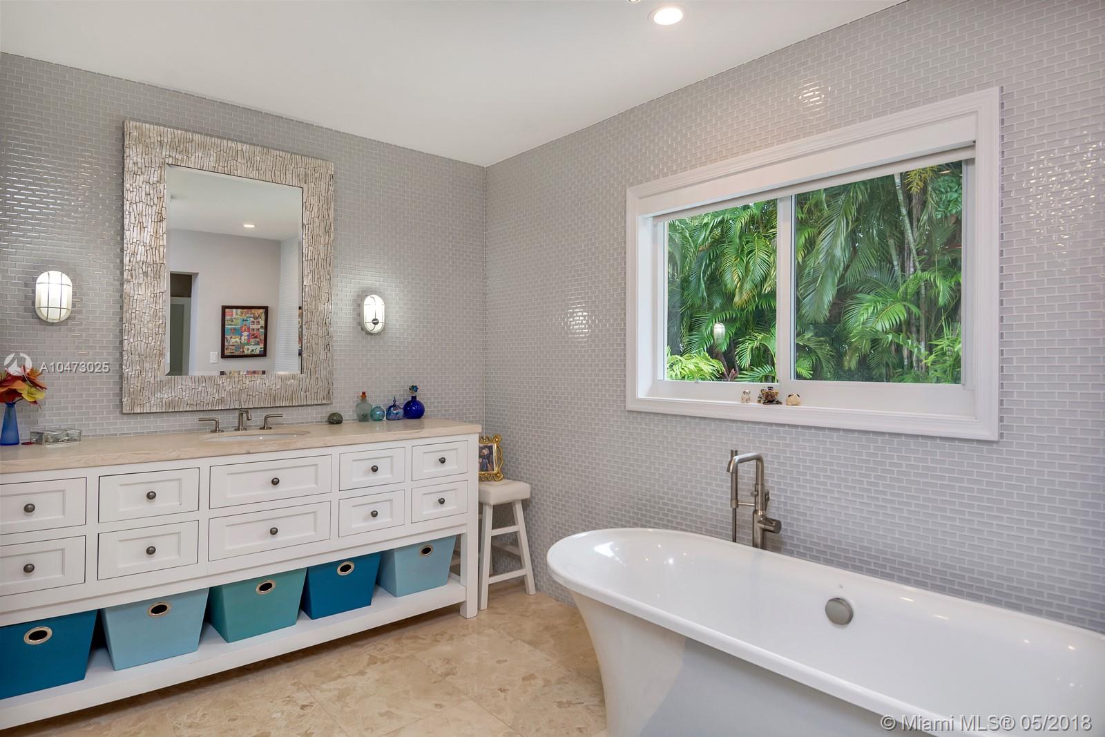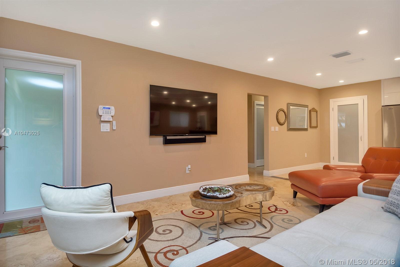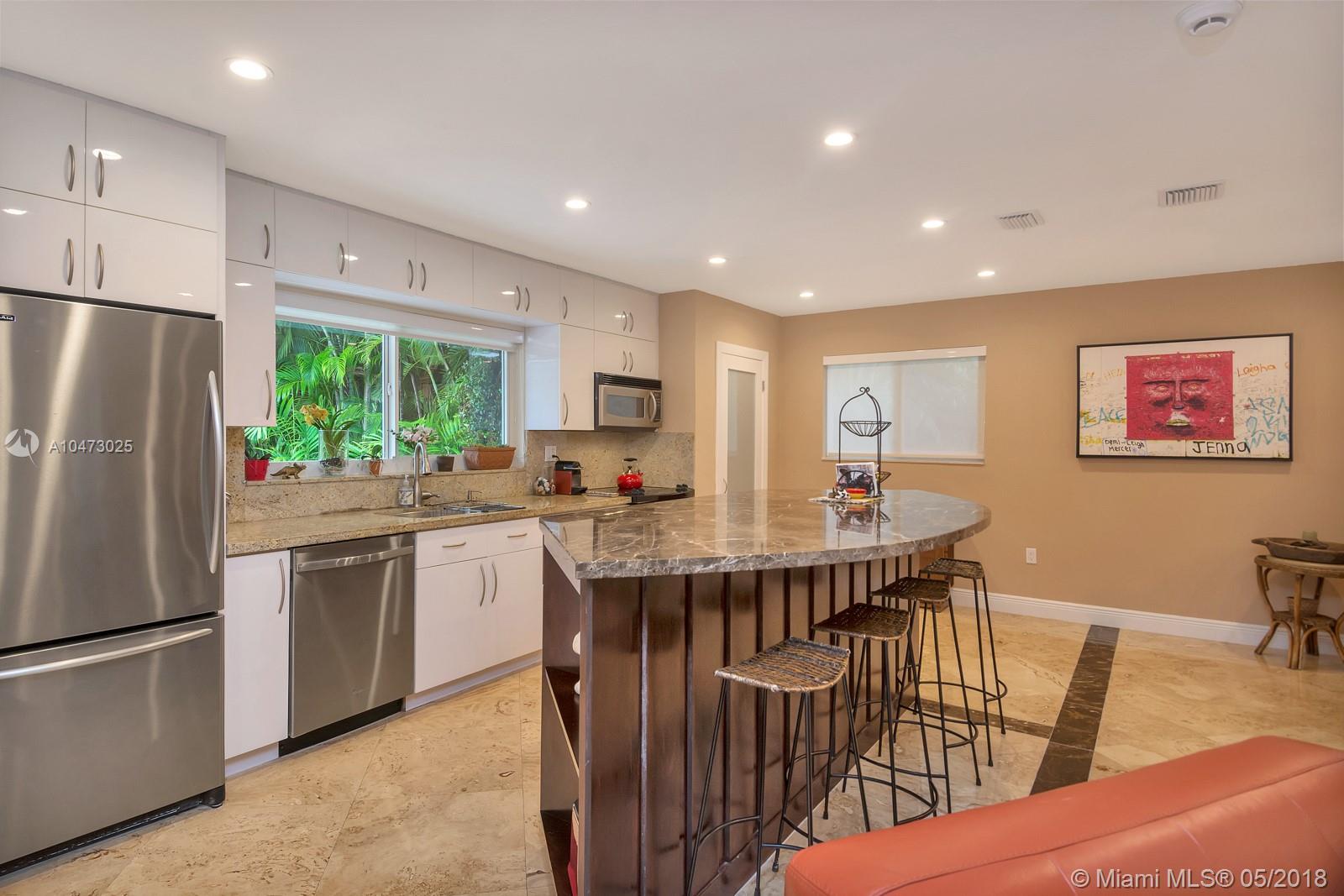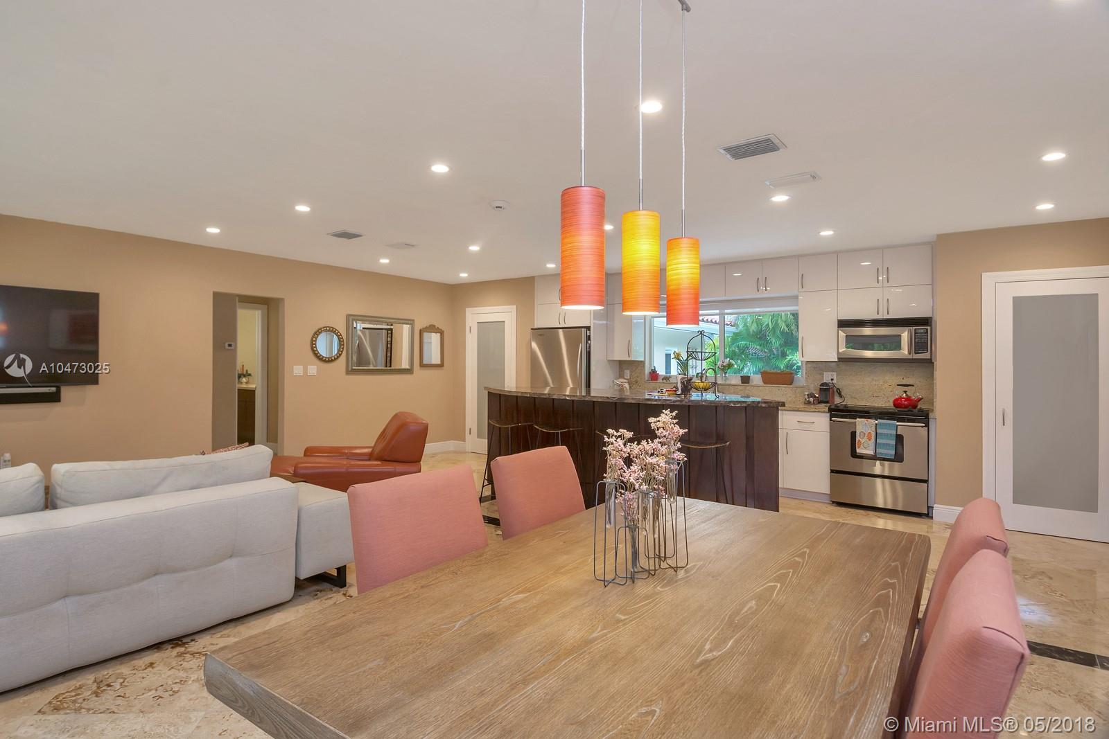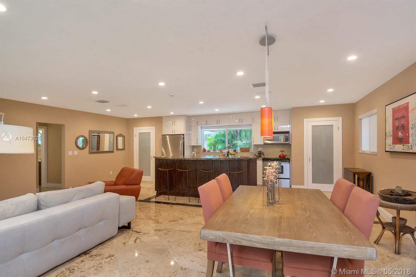 Beautiful property located in the heart of Gables with walking distance to Miracle Mile's restaurants and shops. Recently remodeled home with an open living/dining area and a fireplace. Spacious open floor kitchen with a soothing view of its patio and pool, great for entertaining. Impact windows, surveillance system, automatic sprinkler system are included. The garage does not fit a car, currently being used as storage. Don't miss this opportunity to own this wonderful home!