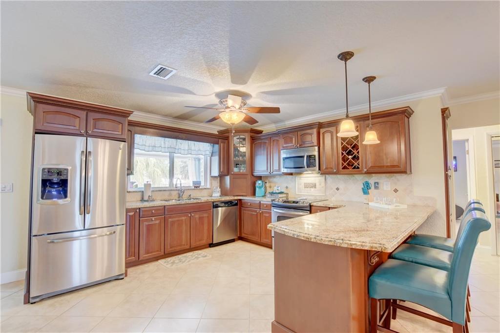 Top rated schools!! Recessed lighting the knockdown texture walls & ceiling to the crown molding & the updated fans/lights. The kitchens/baths have been completely remodeled w/granite in the kitchen & marble counters/showers in the baths. The tray ceiling in the bathroom adds even further elegance! Head out back through the dustless blind french doors & sit at your tiki bar with kitchen while friends enjoy your saltwater & heated pool w/fountain! Later, use your 15k lb boat lift & head into the ocean!