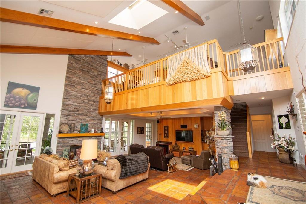 CUSTOM LAKEFRONT HOME ON BUILDERS ACRE! ENTER DOUBLE DOORS TO AN AMAZING LIVING AREA! HUGE STONE FIREPLACE & BEAMED VAULTED CLGS. CUSTOM KITCHEN W/ BUILT-IN BRKFST NOOK, GAS COOKTOP, DOUBLE OVENS, HUGE ISLAND, ELEVATOR TO LOFT AREA & FABULOUS MASTER STE & BATH W/SHOWER & JACUZZI TUB, SITTING ROOM & MORNING BREAKFAST BAR, BALCONY OVERLOOKS LAKE, HUGE OFFICE W/WET BAR OR 3RD BEDROOM, OUTDOOR SCREENED PATIO W/A BUILT-IN BBQ SUMMER KITCHEN, ROLL DOWN SHUTTERS, AUTO ON GENERATOR & NEW ROOF. A MUST SEE!!