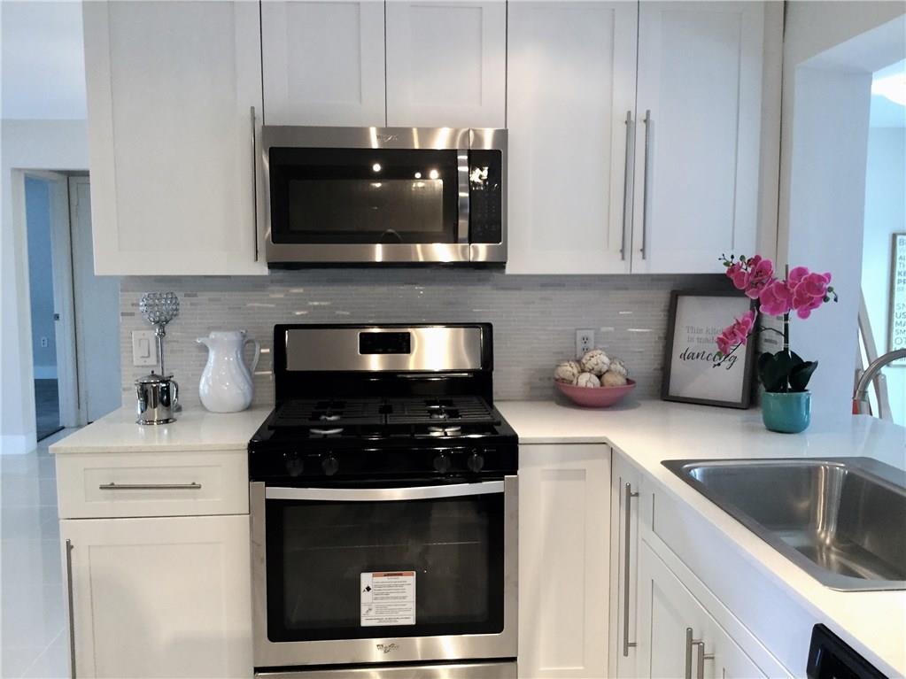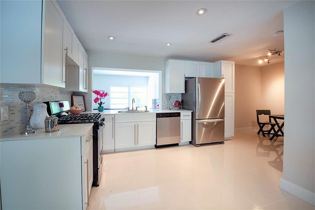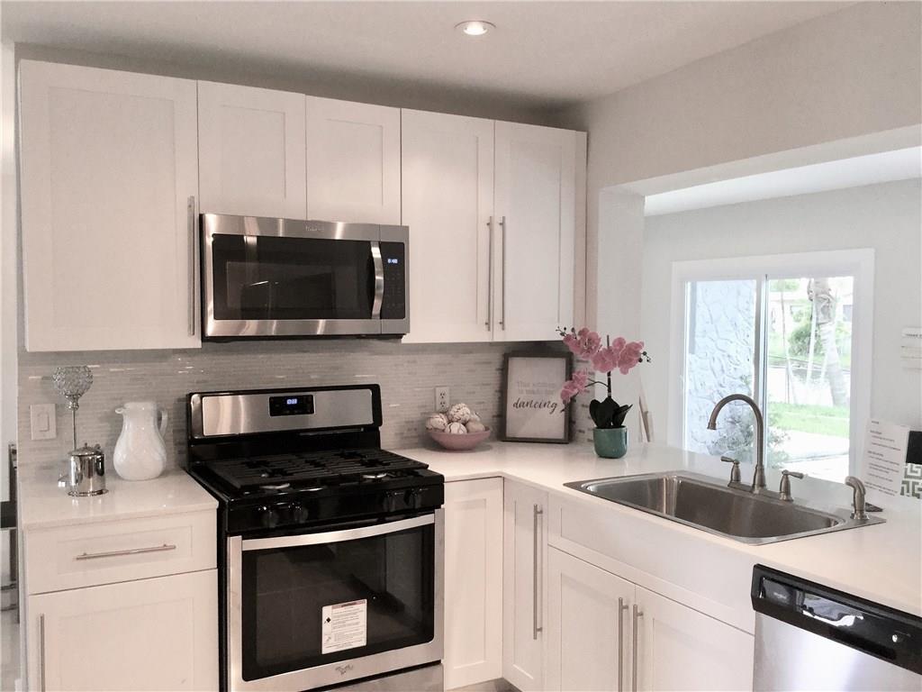 Completely remodeled modern design 3 bed, 2 bath w/ garage on the water. Thoughtful, generous open living spaces w/ 24" ceramic tile, recessed lighting, all new kitchens, baths & lighting. Gas stove, quartz counters, tiled backslash, Whirlpool appliances, eat-in kitchen, bar seating, over-sized family room, master w/ walk in closets, modern baths & much more! Lovely fenced backyard patio/entertaining space on the canal with room for a pool. Wonderful curb appeal. Move right in!