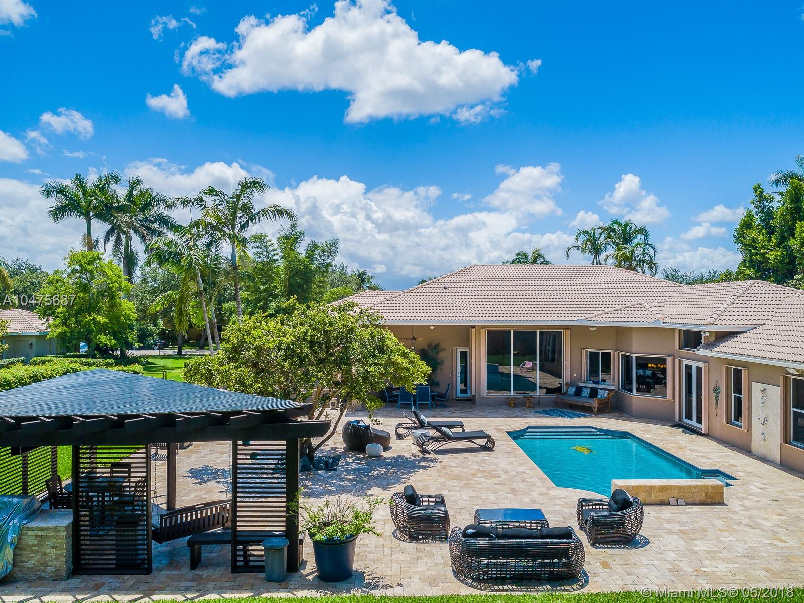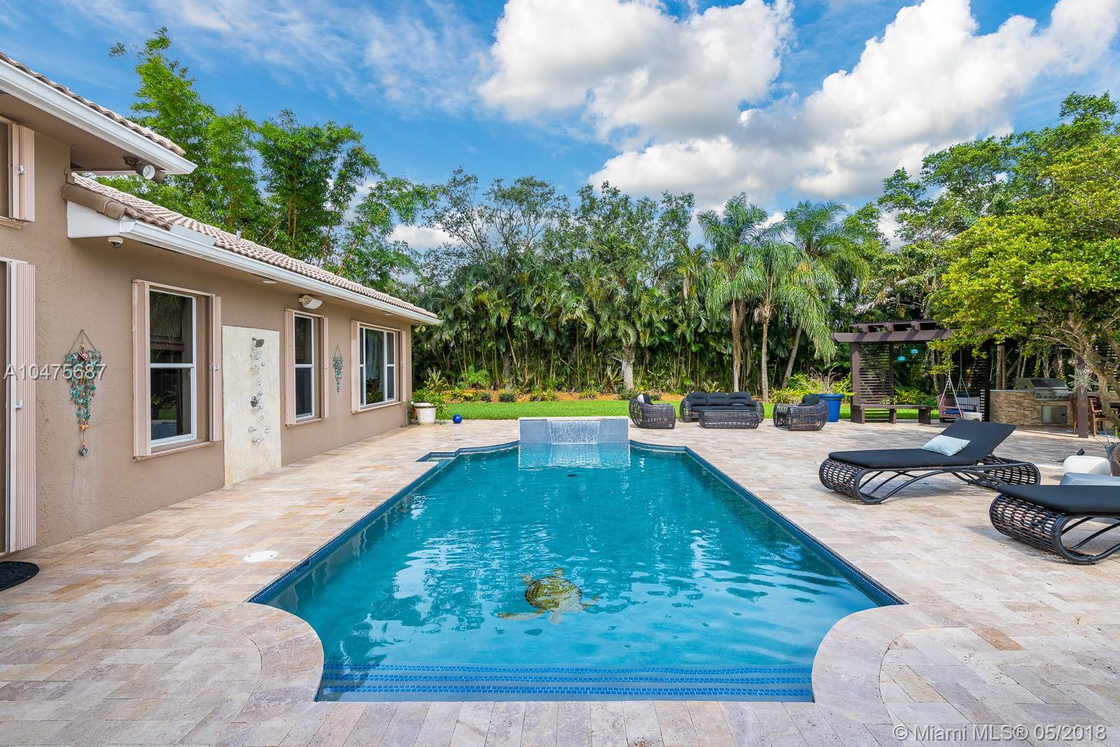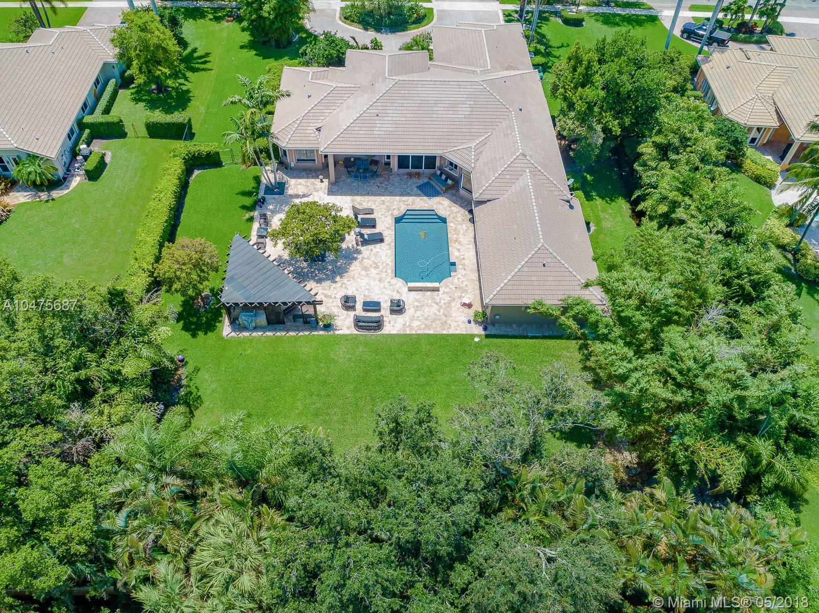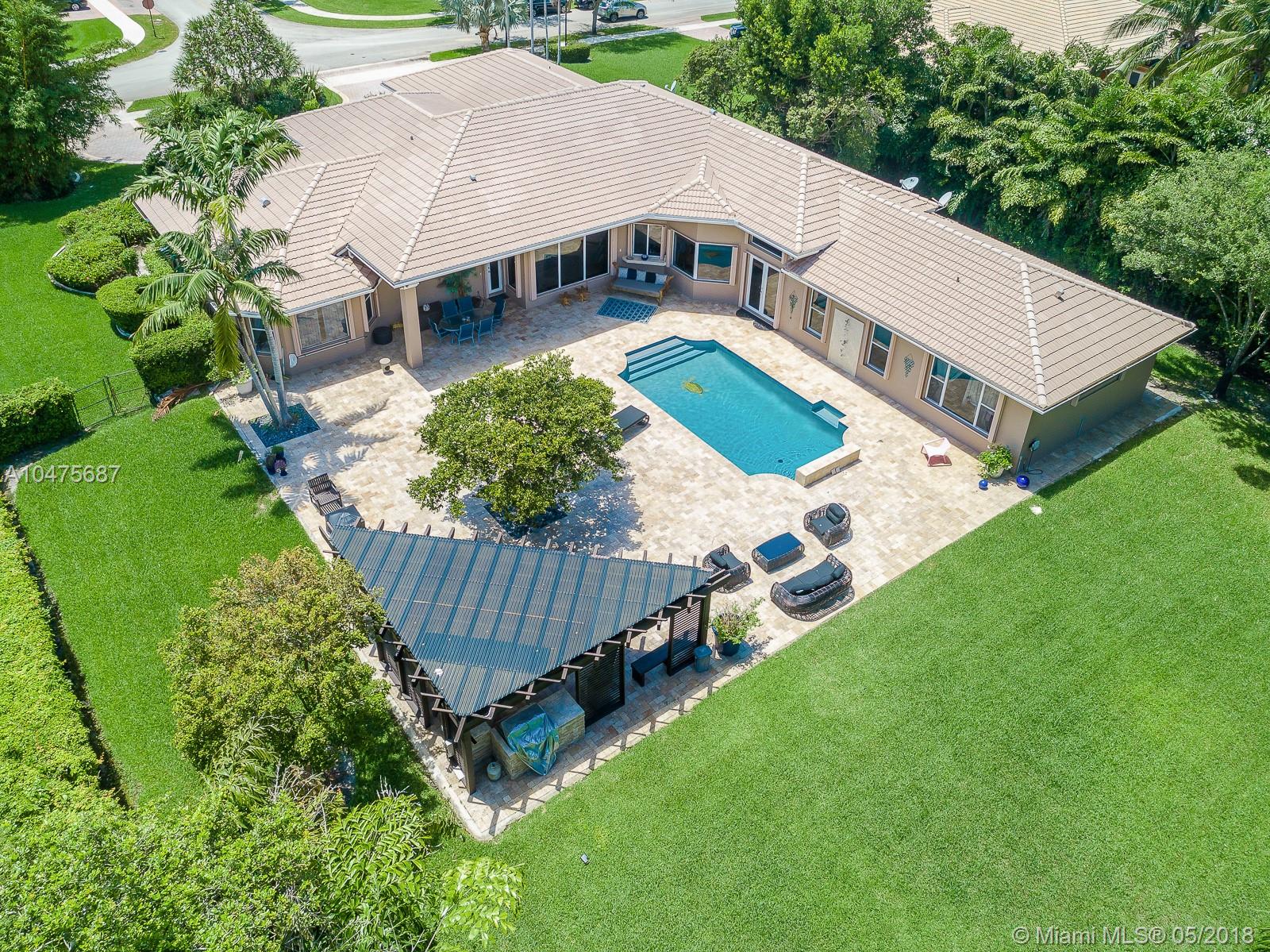 Sprawling 1-story triple split over a builder’s acre within exclusive guarded comm completely remodeled (2014-15) front-to-back. Appointments of sleek marble counter tops, Brazilian hardwood floors, Bosch/KitchenAid stainless steal appliances, living room bar, theatre room, grand floor-to-ceiling windows showcase outdoors boasting poolside, travertine stone, summer kitchen. The addition towards the back of the home extended the Derby model by a third wing, (1000 SF 2 bedrooms | 1 bathroom). Outstanding poolside/summer kitchen encased in sculptured light brick finish, amidst extensive travertine stone flooring. Located off Nob Hill close to A+ schools, quick commutes shoppes and malls, ball fields, and 20 minutes to Fort Lauderdale Airport, and beaches.