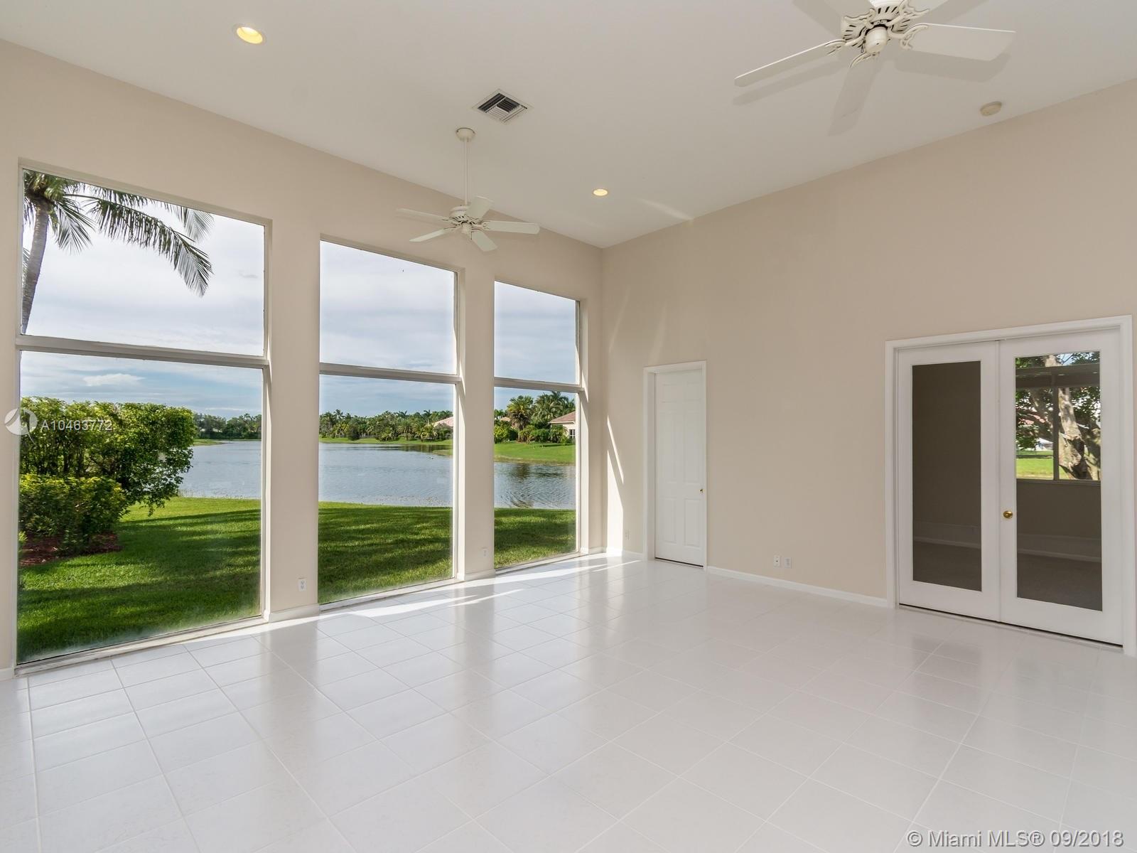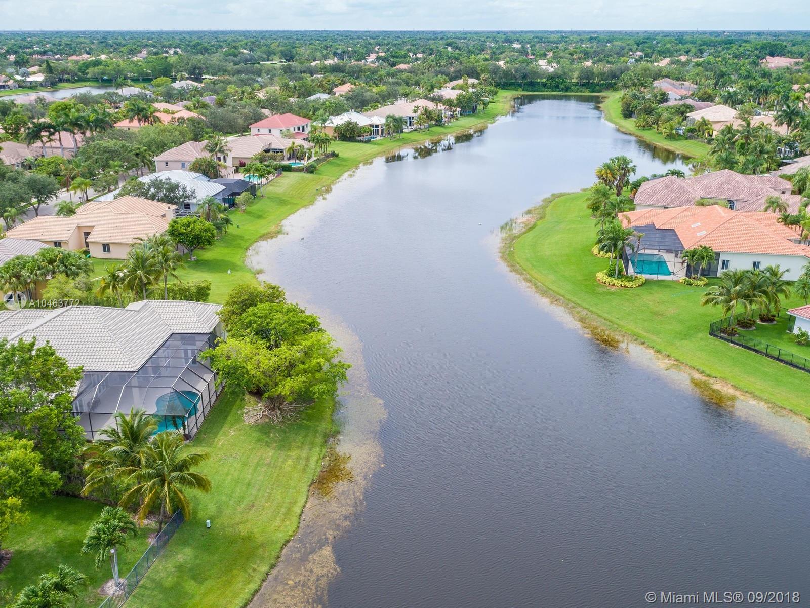 Stunning contemporary home with panoramic lake views. Located on a private and quiet cul-de-sac with one of the most premier waterfront lots in Weston Hills. Soaring 14 foot ceilings with custom designed windows to showcase spectacular lake views. Open and inviting floor plan, French doors leading out to patio. Spacious 5 bed/5 full baths + office, which also qualifies as a 6th/bed with closet . Pristine tile floors in living areas. Kitchen features center island with gas cook top, 42"cabinets and desk area. Newer roof installed Oct. 2011, 3 zoned A/C's, & 80 gallon water heater. Walk in closets throughout. Enjoy South Florida outdoor living and entertaining with large covered & screened pool/patio, all with serene & spectacular water views. All with Weston's great schools!
