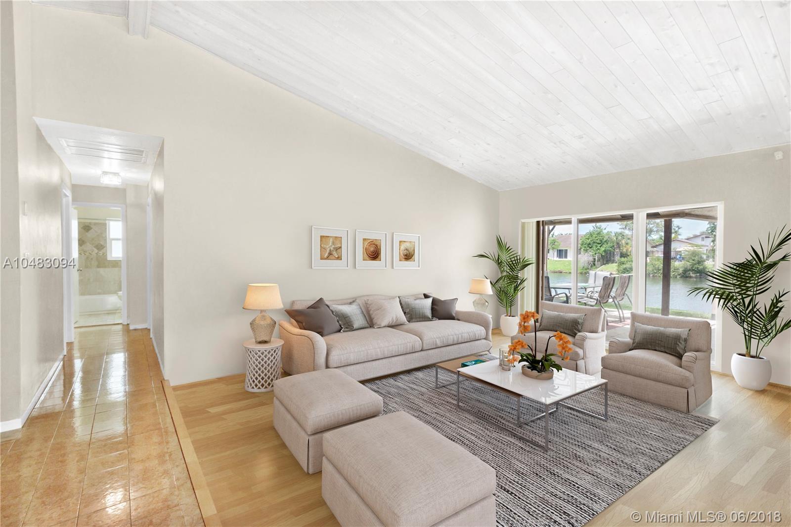 MAGNIFICENT CATHEDRAL WOOD CEILINGS WITH AWESOME LAKE VIEWS! Foyer entry opens to high cathedral wood slat ceilings providing an open and airy feel. Lake views from all Living areas, and Master Bedroom! Wood laminate flooring in living areas and all 3 Bedrooms. Tile in Kitchen, dining and hallways. NO Carpet! Hurricane Impact Windows & Doors. NEW AC (2015) NEW Hot Water Heater (2017), Roof 2005. Home is meticulous and in great condition. Back patio features wood pergola, and wood deck with built in jacuzzi.