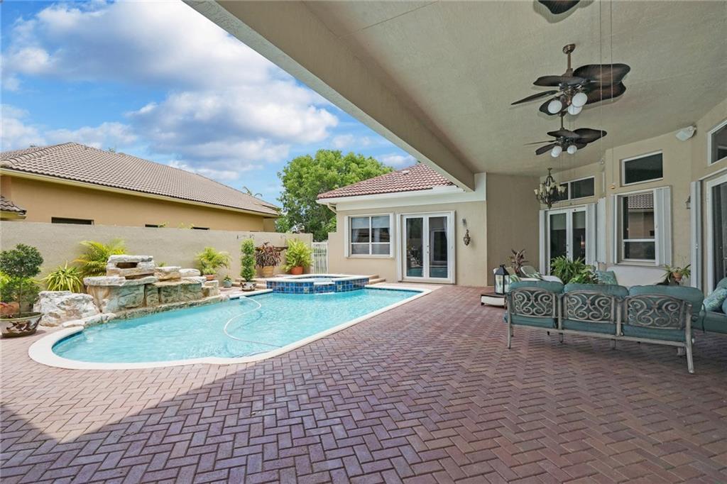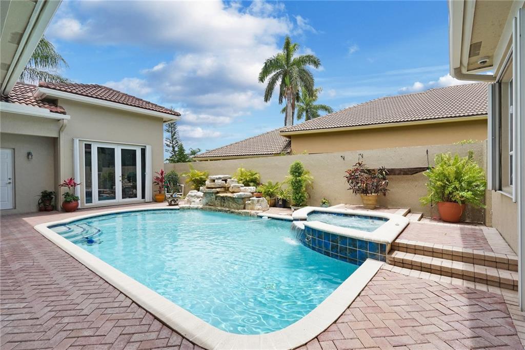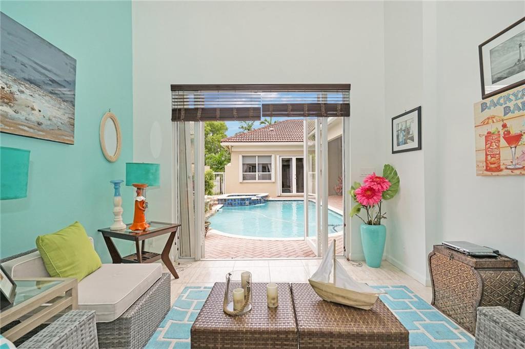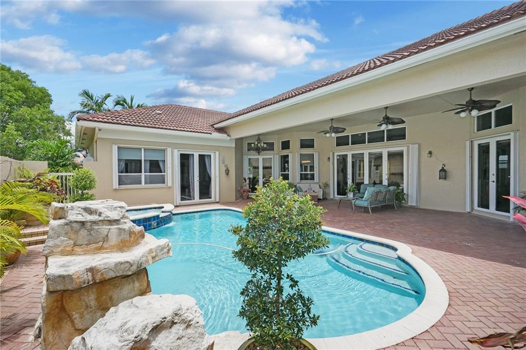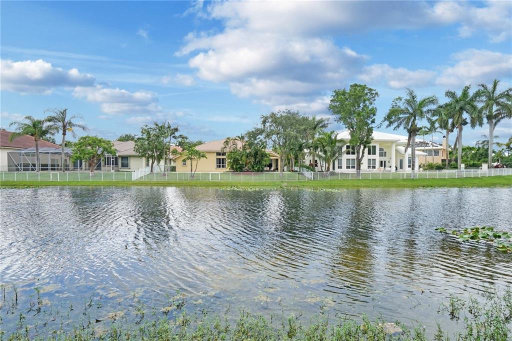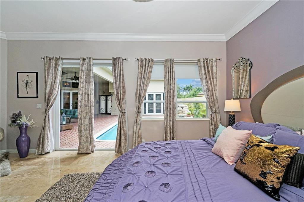 This gorgeous 4 bedroom courtyard home with pool & lakefront is a perfect "10" ready for entertaining. Gourmet kitchen remodeled with quartz, stainless appliances & custom cabinets opens to a huge family room overlooking the sparkling pool/spa/waterfall. Saturnia marble floors, high ceilings, spacious rooms, surround sound, this home has it all and is move-in ready. Whole house generator and some accordion shutters. Guest house with full bathroom & wet bar. Must see!