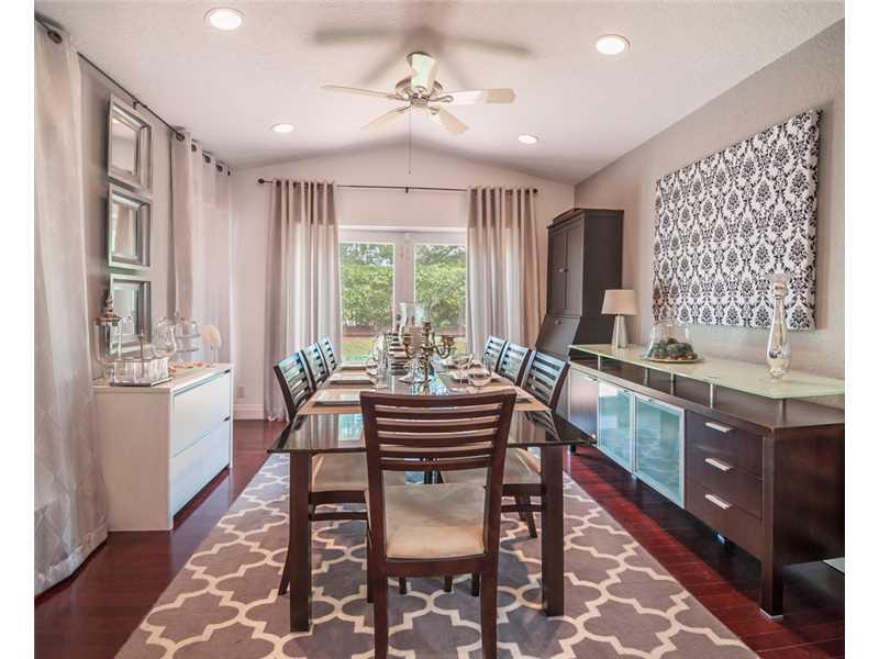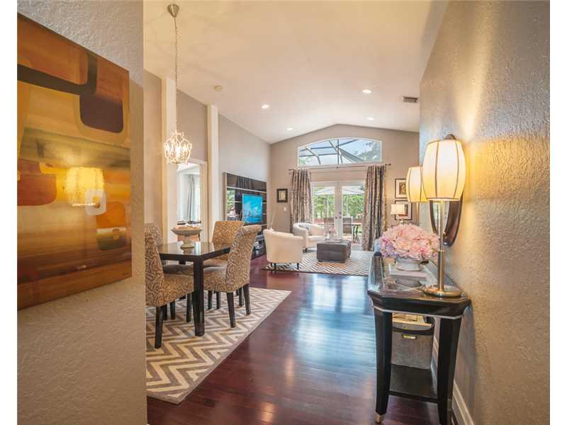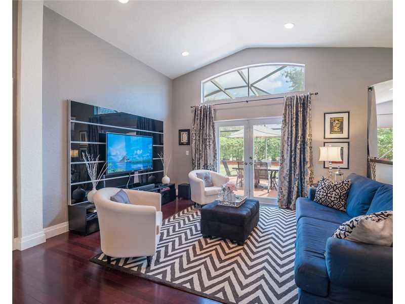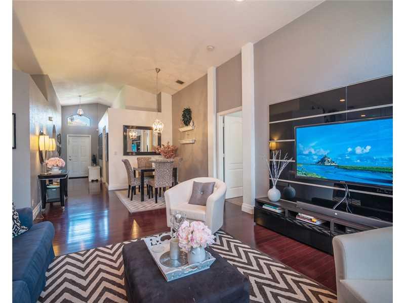 In the desirable Pembroke Pines west community of Encanta, this 3/2 1-story home features upgrades throughout: remodeled kitchen w/knocked down wall overseeing the formal living room and formal dining room. The family room, adjacent to kitchen is currentl y being used as a secondary dining area. Vaulted ceilings. Master has 2 walk in closets 2 bathroom sinks, tub and shower, 4th bedroom located in garage. Very private backyard w/screened patio. Newer A/C. Community Gym, Pool, tennis & basketball courts!
