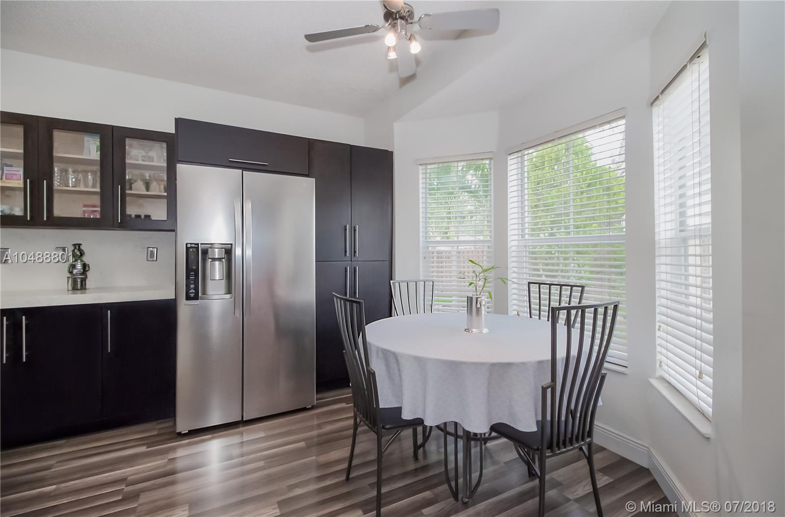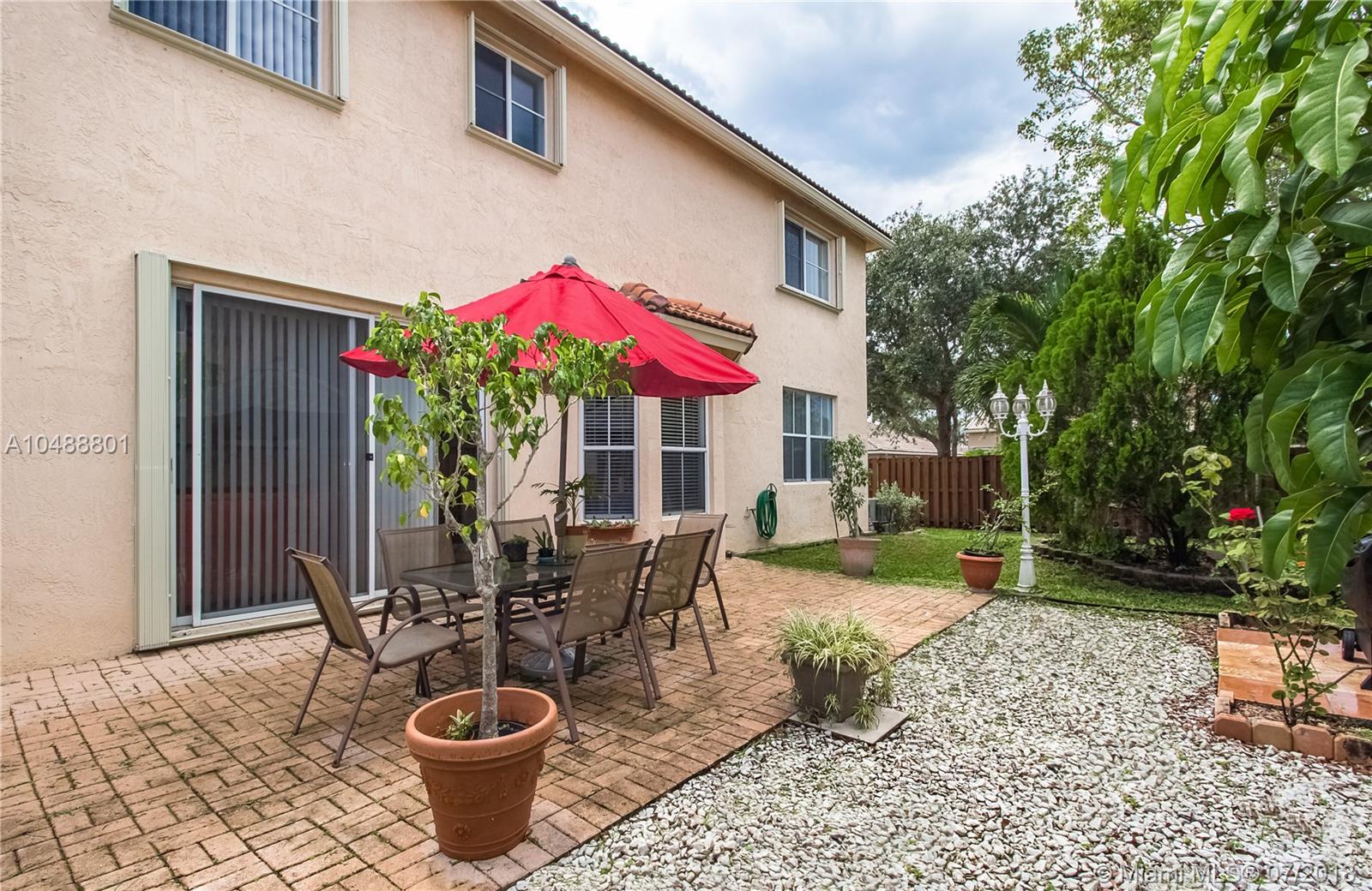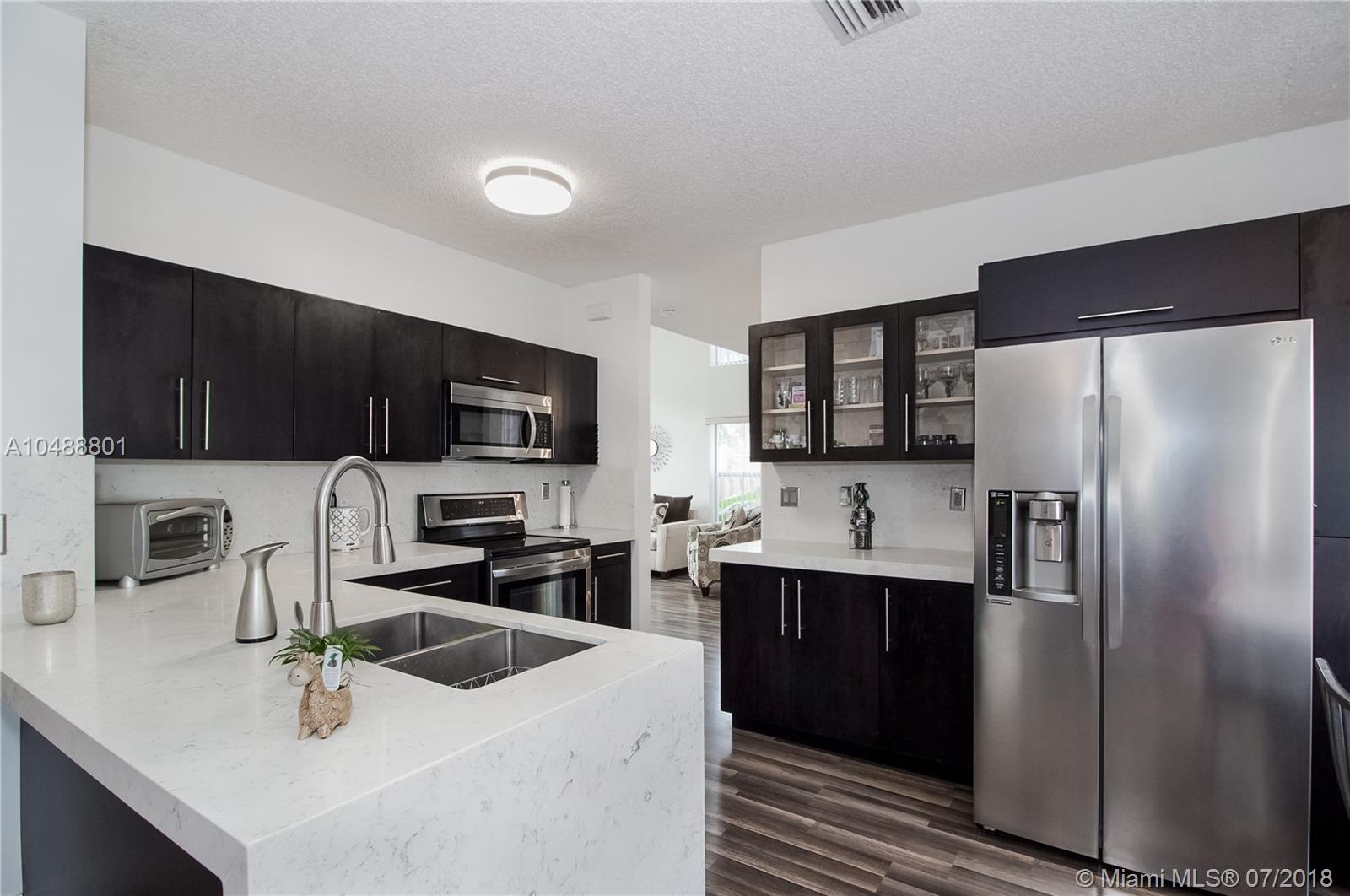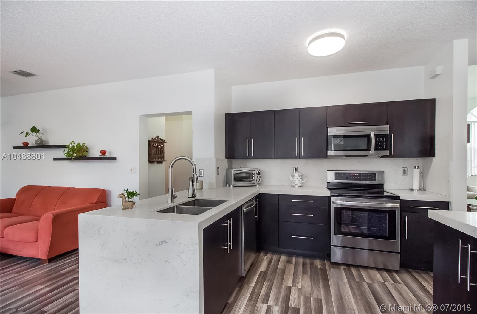 This gorgeous 4/3 in a gated community in Davie is ready to go!!! Renovated less than 3 years ago, property boasts wood kitchen cabinets with Carrara Quartz counter top and back splash, stainless steel appliances, laminated floors in first and second floor, accordion and panel shutters, gutters and paved patio. Very spacious floor plan that includes living, dining, 1 bedroom and 1 bath, breakfast area and family room on the first floor and 3 bedrooms/2 baths on the second floor. BB-Q Area, for memorable family gatherings. Small family oriented community. Good school system. Centrally located with 5 minutes access to I-595, I-75 and Sawgrass expressway. 20 minutes away from Ft Lauderdale airport and 25 minutes to FLL beaches. Low association fee. As-Is.