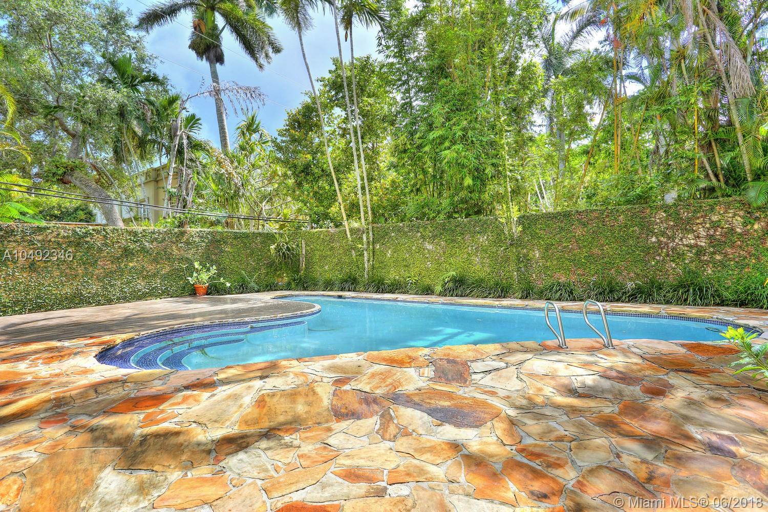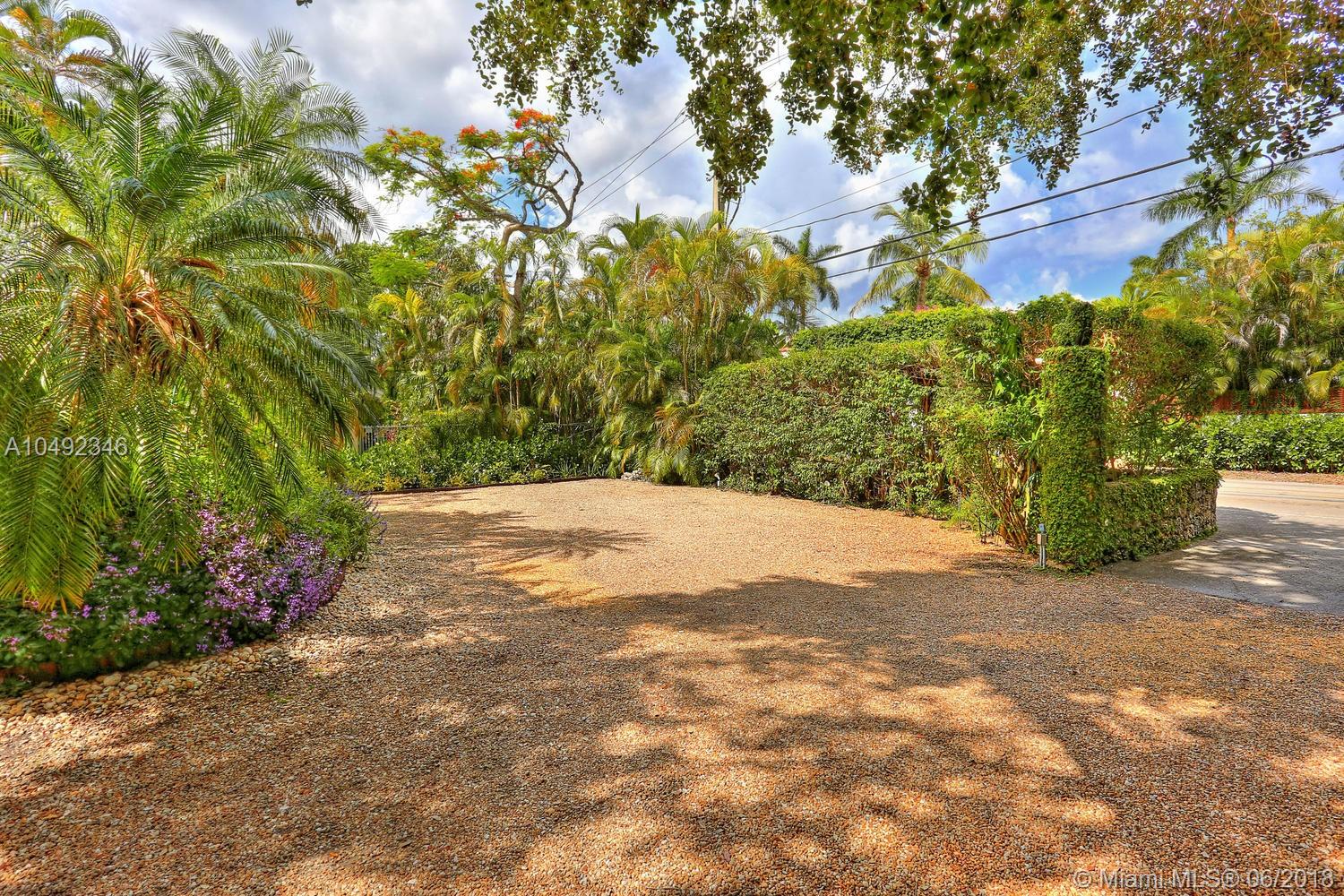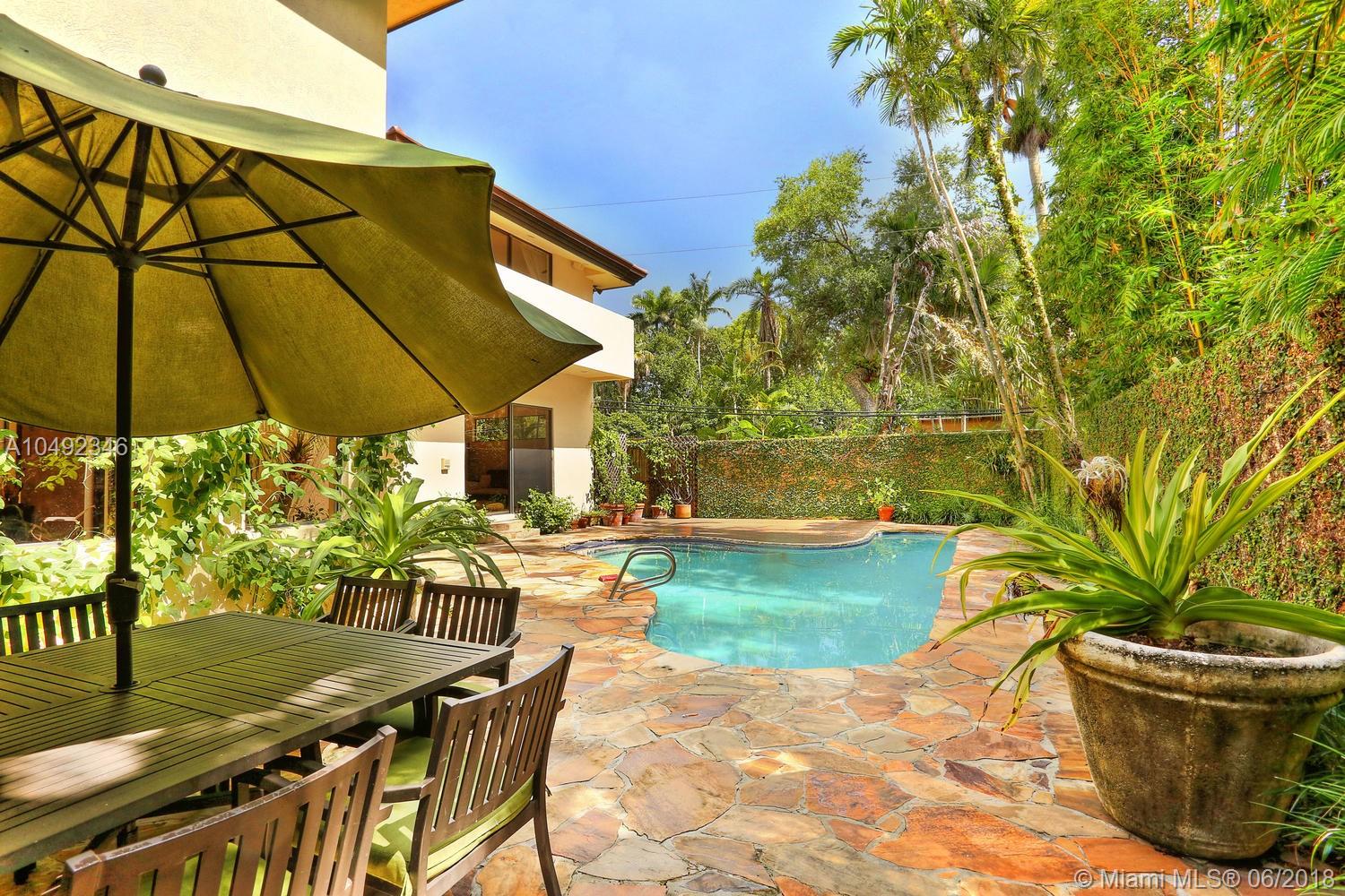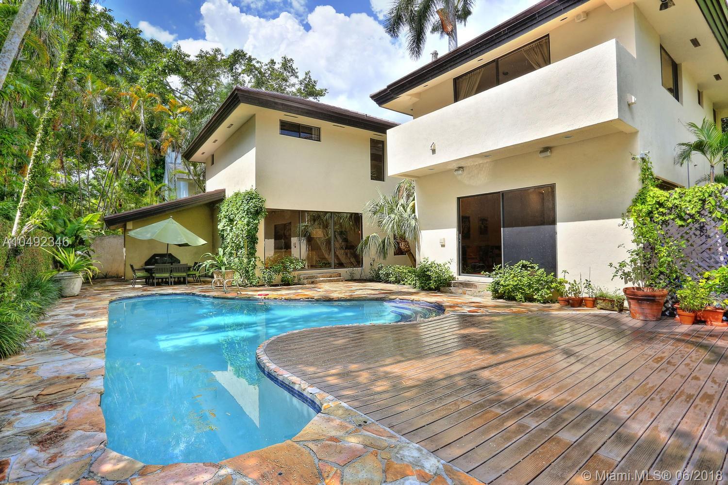 Lovely gated home, set back behind a coral rock wall & privacy hedge in lush South Coconut Grove. Light-filled rooms with high ceilings & stunning new hardwood flooring. Formal living, dining and family room, overlook tropical garden. Open kitchen features wood cabinetry, granite countertops, stainless appliances & adjacent breakfast area. Downstairs guest/housekeepers room. Second floor consists of 3 bedrooms with new en-suite baths and a large master suite with separate sitting area, balcony & new spa-like master bath. Expansive, walled backyard with tropical pool and terrace. New roof. Walk to highly rated private schools and to the Grove village center’s galleries, boutiques, cafes, bayfront parks & marinas. Minutes to downtown, MIA, Coral Gables, Key Biscayne and the Beaches.