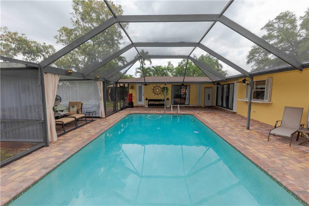 Run to your new pool home in Plantation with stone pavers surrounding the pool and sitting area with drawn shades for relaxation. Wide open kitchen and family room great for entertaining with tile floors. Enjoy your dinners or entertaining with a rock wall dining room with wood floors off of the pool. Warm neutral colors with fresh interior paint with baseboards and crown molding. Updated bathrooms. You will not be disappointed. Come and view your new home before someone else does!