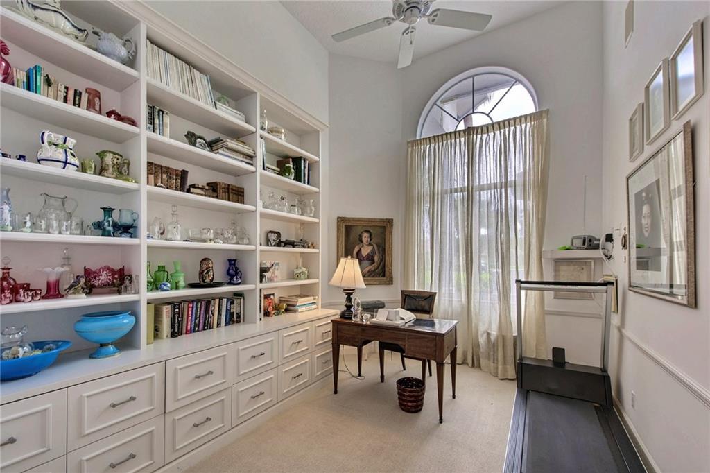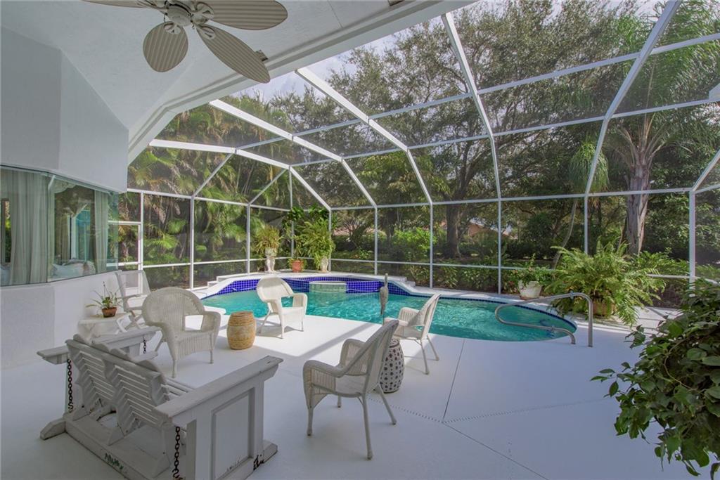 Warmth, light & charm describe this home on tropical cul de sac street of custom homes in prestigious Eagle Trace. Durable terra cotta stone tile living areas & hi end laminate bedrooms. French doors, clerestory & palladium windows, radius walls, & volume 14' flat ceilings. Desirable split bedroom floor plan & luxurious master suite, large bay window sitting area with built-in bench. Lush landscaping surround screened pool, raised spa & patio. 4 column portico entry & enormous circular paver driveway.