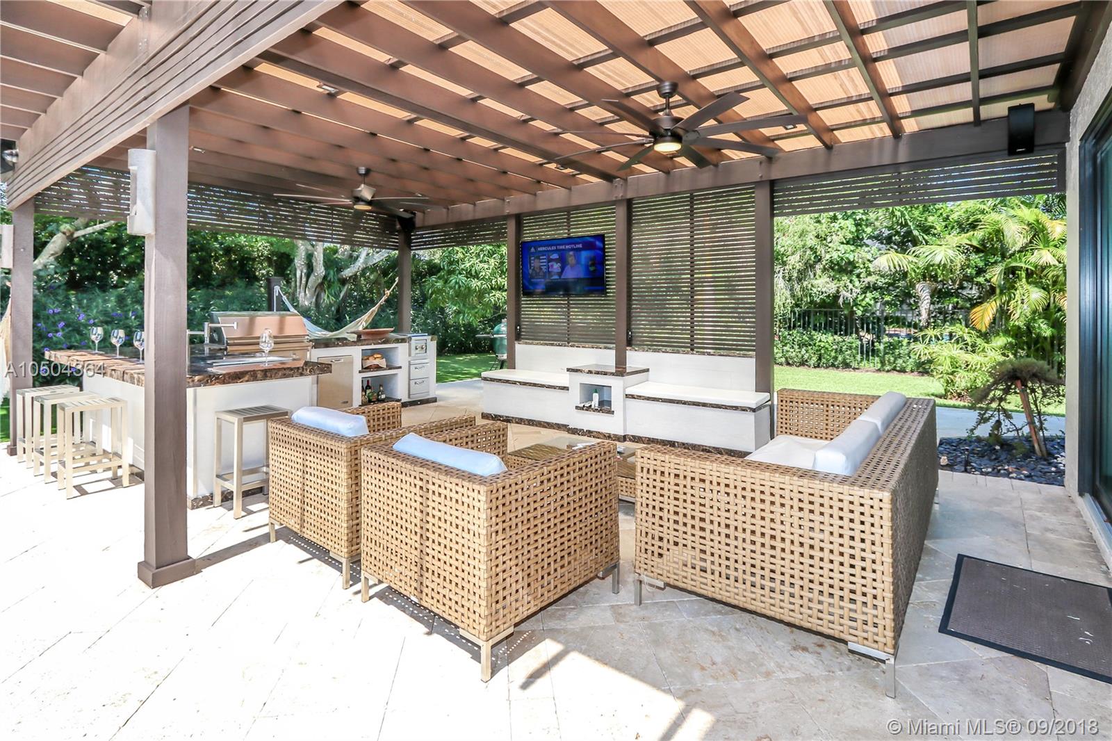 Stunning 4BR 3.5BA 1 story pool home in Tequesta sits on a massive private lot with no neighbors to the rear. New Roof, Custom Impact windows & doors. Eco Smart water system. Custom doors and hardware in all rooms and front entry door. Custom hurricane proof garage door.Security cameras.Beautiful floors throughout.Contemporary kitchen + butler pantry.Indoor bar.Huge Office/Den that can easily be converted into 5th bedroom if needed.Formal living room,dining room,family room and outdoor covered dining area.The outdoor living space has a fantastic custom pergola with a complete kitchen featuring Lynx appliances, 2 lounging areas with TV,hammocks, custom fire pit and an amazing spa. Pick a mango off the tree and enjoy the lush serene tropical landscaping and pool views.Over $400k in upgrades!