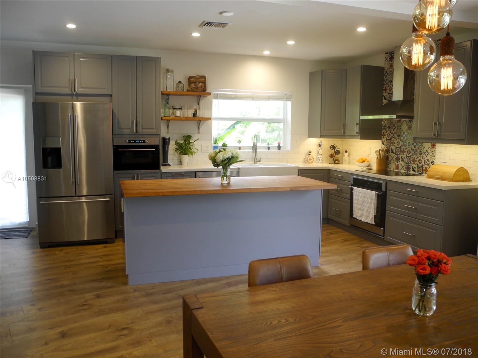 One-of-a kind, dream layout of a house, gutted and tastefully remodeled in 2017 with brand new kitchen, 3 full baths (along with plumbing) electrical, impact windows and doors. Amazing open-design main room that flows from living room into kitchen, perfect for entertaining. Beautiful wide-plank oak flooring throughout, Marca Corona terra-cotta tile design unique in each bathroom and New Mexico tiles as kitchen centerpiece. Custom oak kitchen island top, farmhouse sink, huge cupboards for storage. Gorgeous stacking wall-to-wall sliding door system, with breathtaking 13’ opening making indoor/outdoor feel like 1 space. Brand new deck steps down to 28’ pool alongside huge yard and gorgeous Japanese Blueberry tree. Cool breezes across the street from water in coveted east end of Miami Shores.