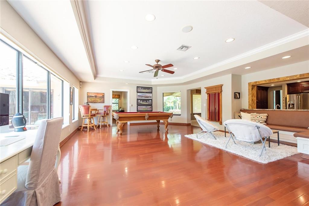 BACK ON MARKET!! CASH BUYER UNABLE TO TRANSFER MONEY! INCREDIBLE OPPORTUNITY!! Exquisitely & completely renovated, .77 acre estate: new, Travertine marble circular driveway; hardwood flrs in LR, FR, game rm & bedrms; duel, stone FPL, custom closets, & crown molding; gorgeous kitchen w/Viking, gas cooktop, pot filler, custom cabinets w/center island, & st. steel appliances; spacious game/playroom; all impact windows & doors & roof '02; 5th BR used as office w/built-in murphy bed; stunning, updated bathrooms; plus screened lanai, htd pool w/spa & fenced yard!