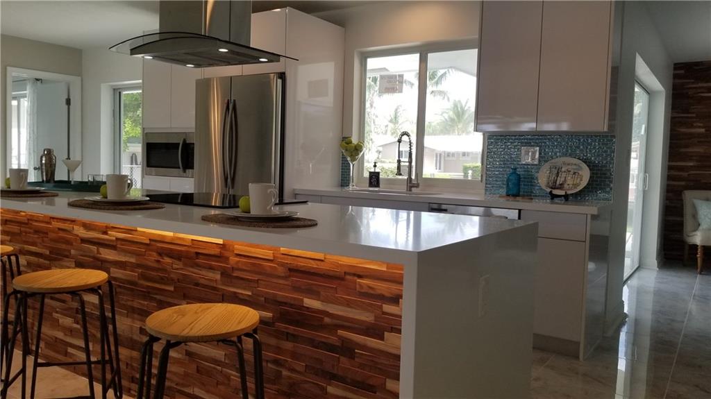 Complete remodel w/permits in sought after Coral Ridge Isles! Ocean access pool home offers 78' waterfront & private dock. Split floor plan, open concept kitchen,living,dining & family rooms show off the sprawling entertaining spaces that flow outside to the pool area. Huge cooking island w/quartz countertop & waterfall edge, modern all new custom kitchen cabinets, just bring the dishes. New 24x24 porcelain tile throughout. NEW vertical impact windows, sliders, roof, electric panels, driveway & MUCH MORE!
