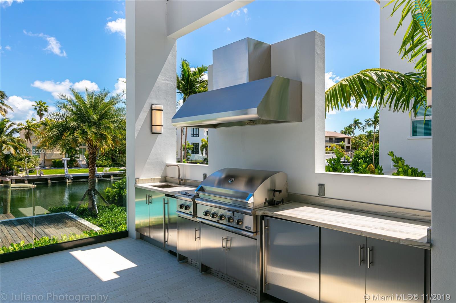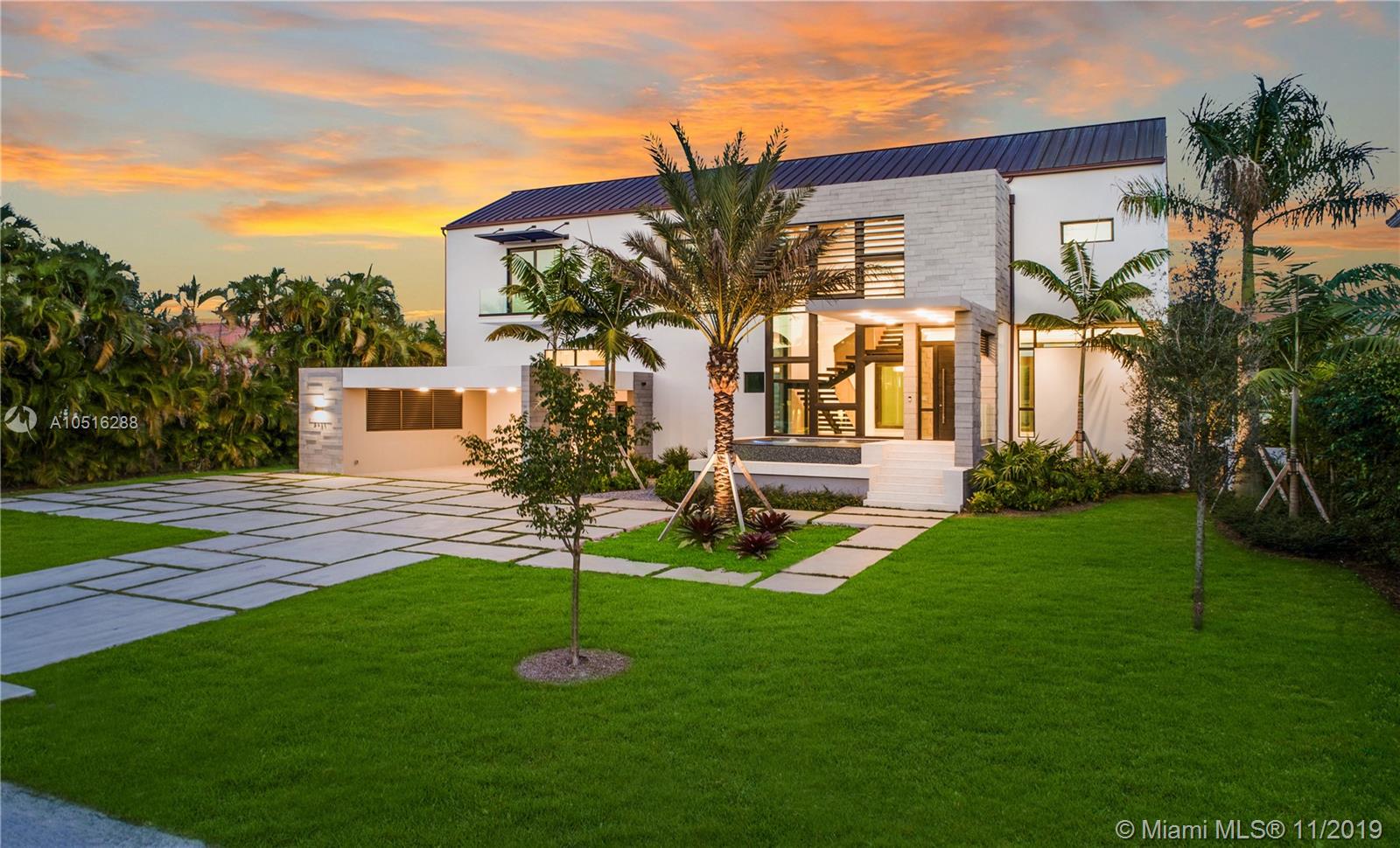 Modern Miami waterfront luxury scaled for gracious living. Thoughtfully conceived, elevated new-construction sited in an intimate, highly sought gated Gables enclave. Ingenious design maximizes every sq ft of lot space. Refreshingly understated interiors; elegant, airy floor plan masterfully flows & functions. Living & dining rooms offer water views. Gleaming Wolfe/Subzero kitchen w/wine cellar & pantry. Sublime master w/sumptuous bath, office, H&H walk-ins, sundeck & outdoor shower. All bedrooms en suite! Wow-factor exterior; kitchen/living/dining & fabulous pool/spa w/island seating & sundecks. New batter-pile fortified seawall; 70-ft dock; no bridges to bay. Rooftop deck affords city views. Built for the ages w/poured concrete, copper, limestone & oak. It’s all that and more!