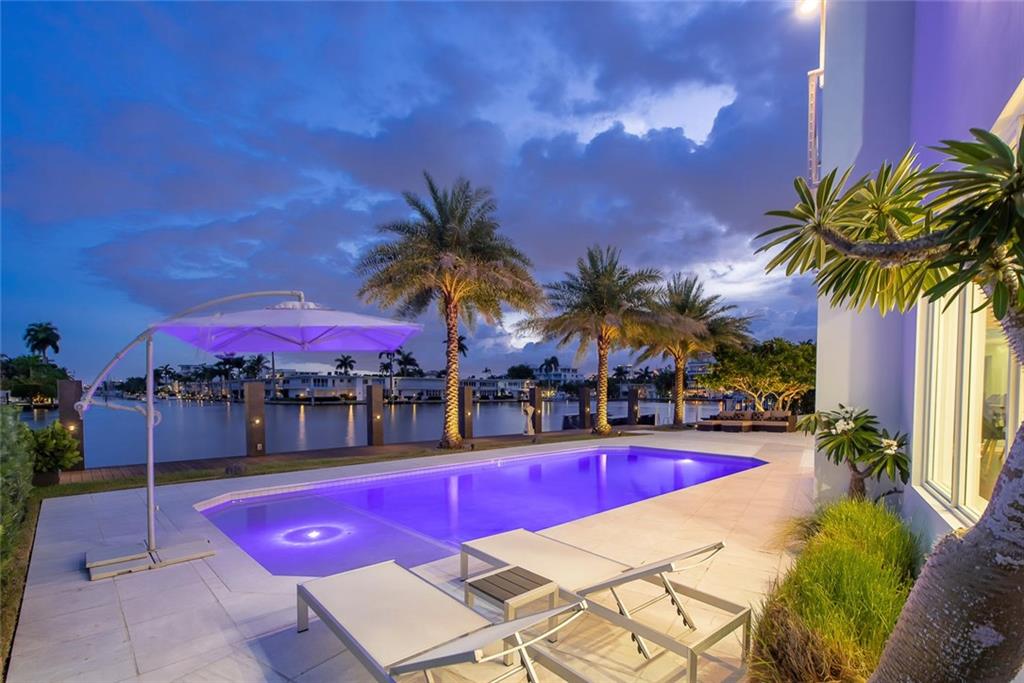 Fabulous Southeast Facing Home on WIDE Rio Barcelona. 95 ft waterfront at gated Sunrise Key, this home recently underwent a studs-in renovation incl: all new floors, lighting, kitchen and baths. Built for Florida, an entertaining home with multiple spacious gathering rooms, walls of impact windows and doors bringing the views inside. A tremendous master wing with 12 ft high ceilings, a sitting room and adjacent office. Balconies and terraces keep the outdoors near. A vast lawn and patio surround the pool.