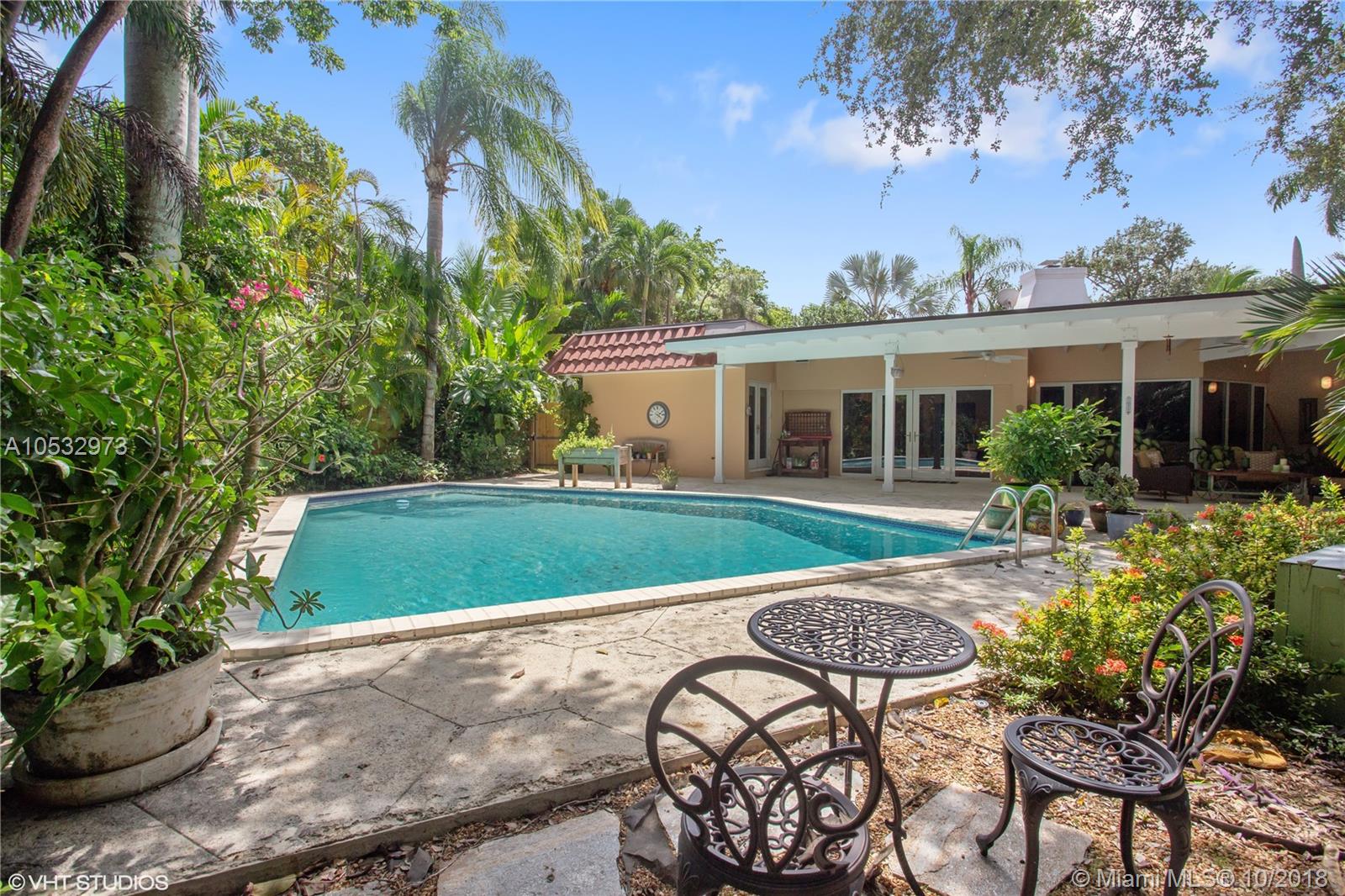 An amazing 3 bedroom 3 bath pool home located in desirable South Coconut Grove. Situated on a large 11,632 sf tropical lot inside a quiet cul-de-sac that is accessed only on a no-thru street. This architecturally interesting home has oversized impact windows & doors inviting grand vistas of lush landscaping surrounding the private fenced yard and pool. Moonlit nights treat all to quite a romantic event. Enter thru a foyer to the dramatic open living room, w/ fireplace, and formal dining room; allowing for free-flowing entertainment to the large covered patio,pool, & grounds or to the open kitchen & family room. The Master bedroom is huge, featuring large bath w/ marble/Coral Rock accents, & 3 double-sized walk-in closets. Two additional "split" bedrooms & garage complete this magical home!
