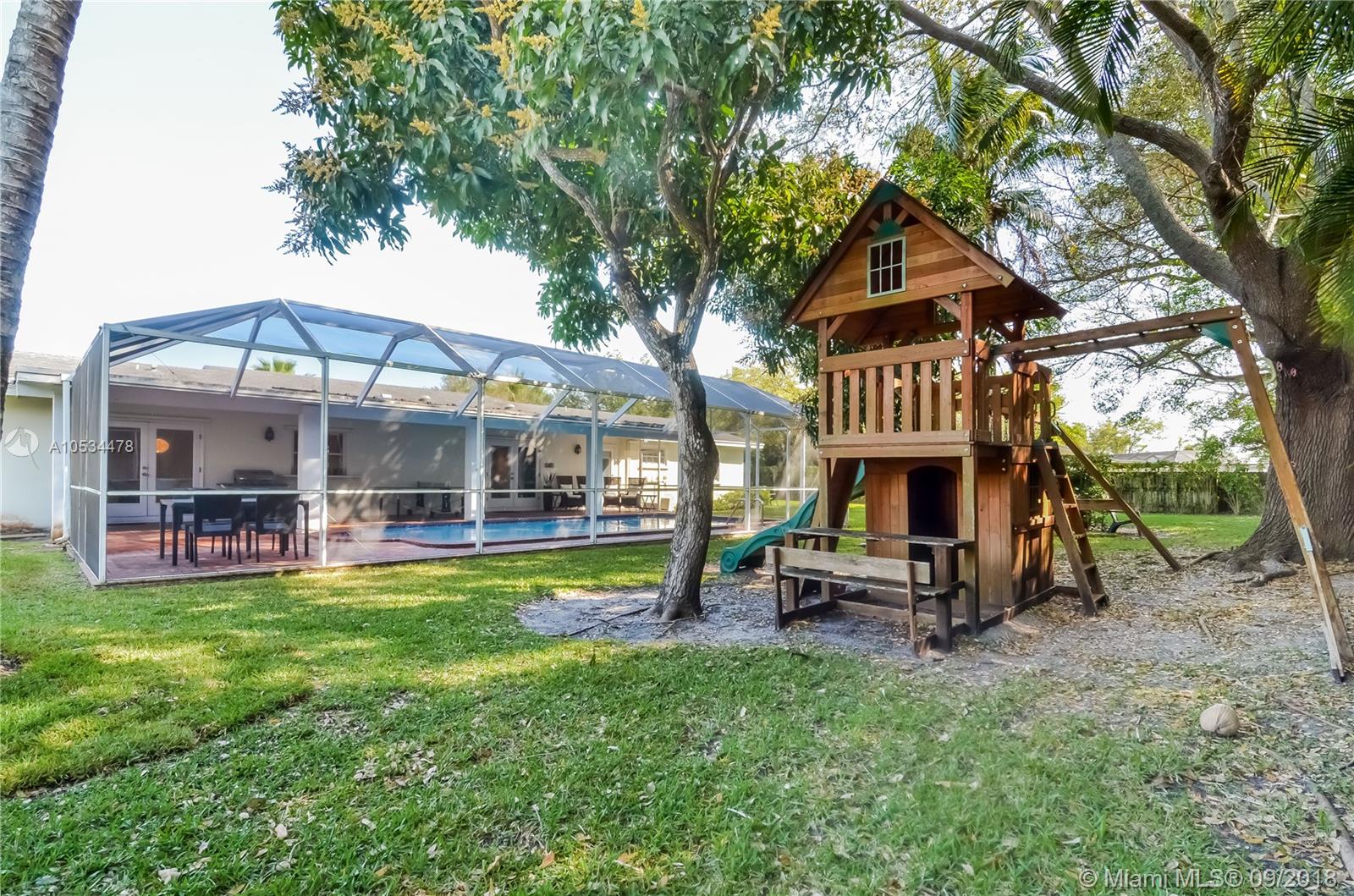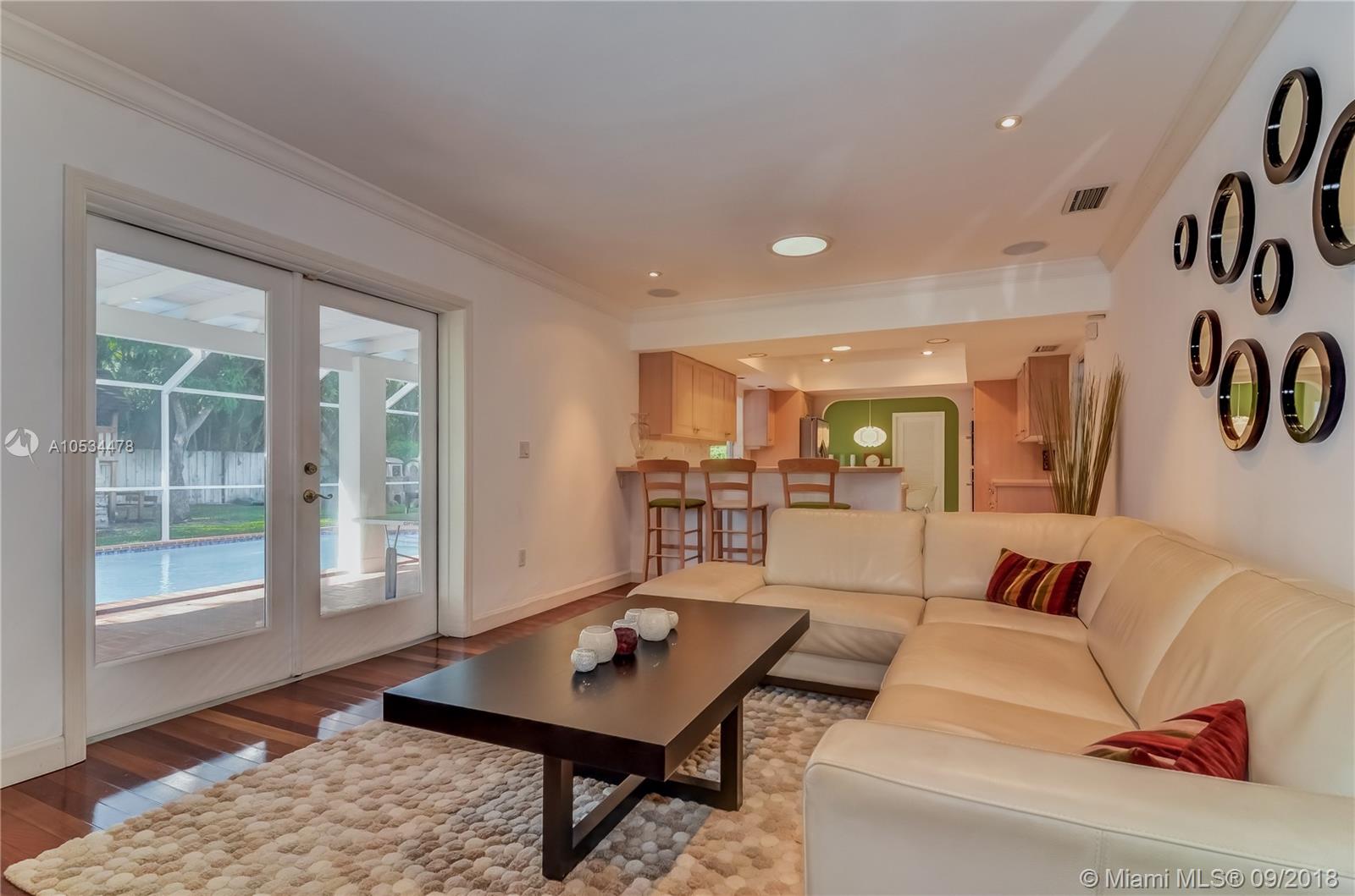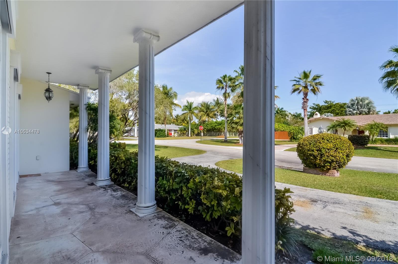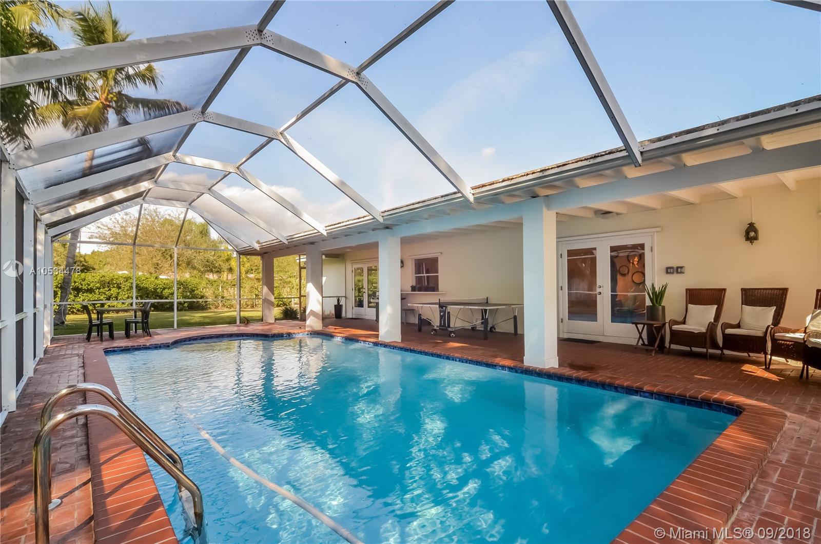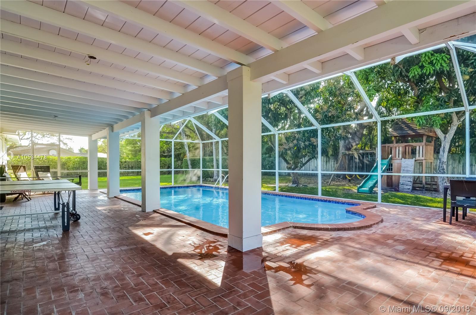 This lovely home is welcoming on the outside with its covered front porch while perfectly situated on a quiet, cul-de-sac in the heart of Pinecrest. Inside it has a contemporary feel and features beautiful hardwood floors, large kitchen with lots of pantry space and lovely pool views. The pool and patio are spacious and screened with a large, covered area for entertaining and a view to the expansive private yard. The master suite offers 2 closets, one walk in. The house is wired for music inside/out, offers great storage throughout, a circular driveway, 2 car garage and brand new roof. This is a great opportunity to buy in Pinecrest!