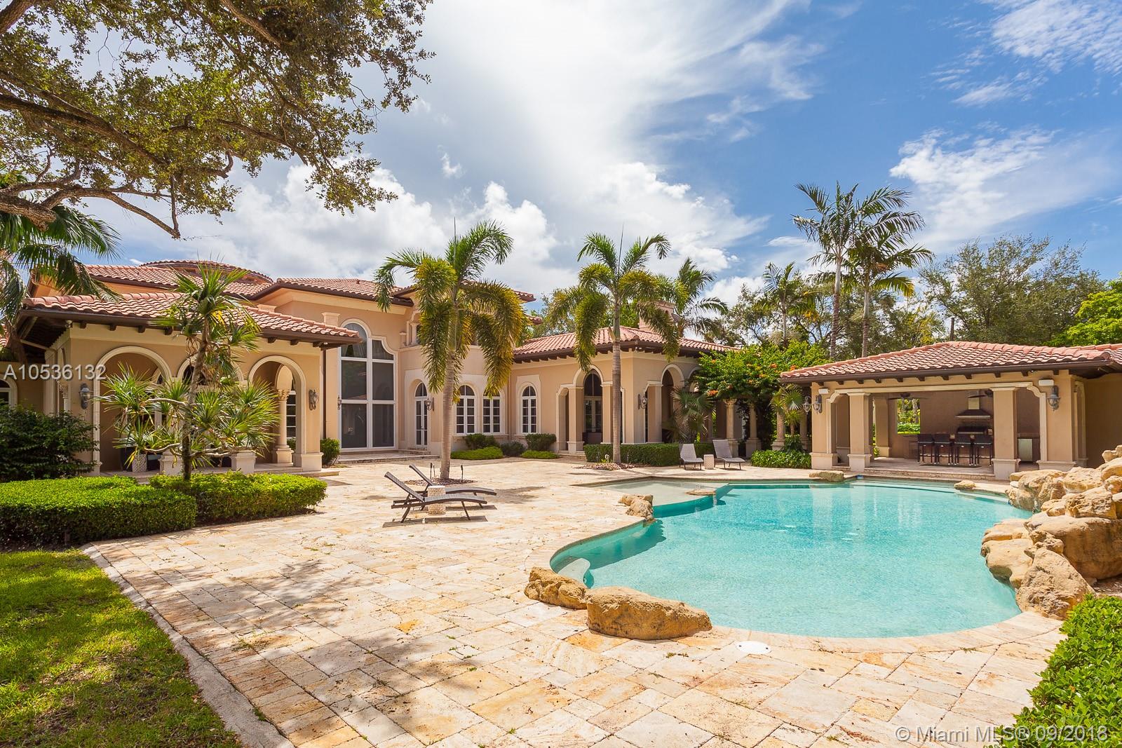 Nestled in the heart of North Pinecrest and surrounded by natural beauty, this stunning 8,506 mediterrenan style, state-of-the art home, sits on over an acre of land. The charming and elegant estate is equipped with top of the line appliances and décor. Interior feature includes large eat-in kitchen, bar area, wine cellar, home automation system with built-in speakers, security system, commercial-grade generator. Great entertainment areas! Enjoy being outdoors with a spectacular lagoon-like pool gazebo, and summer kitchen.