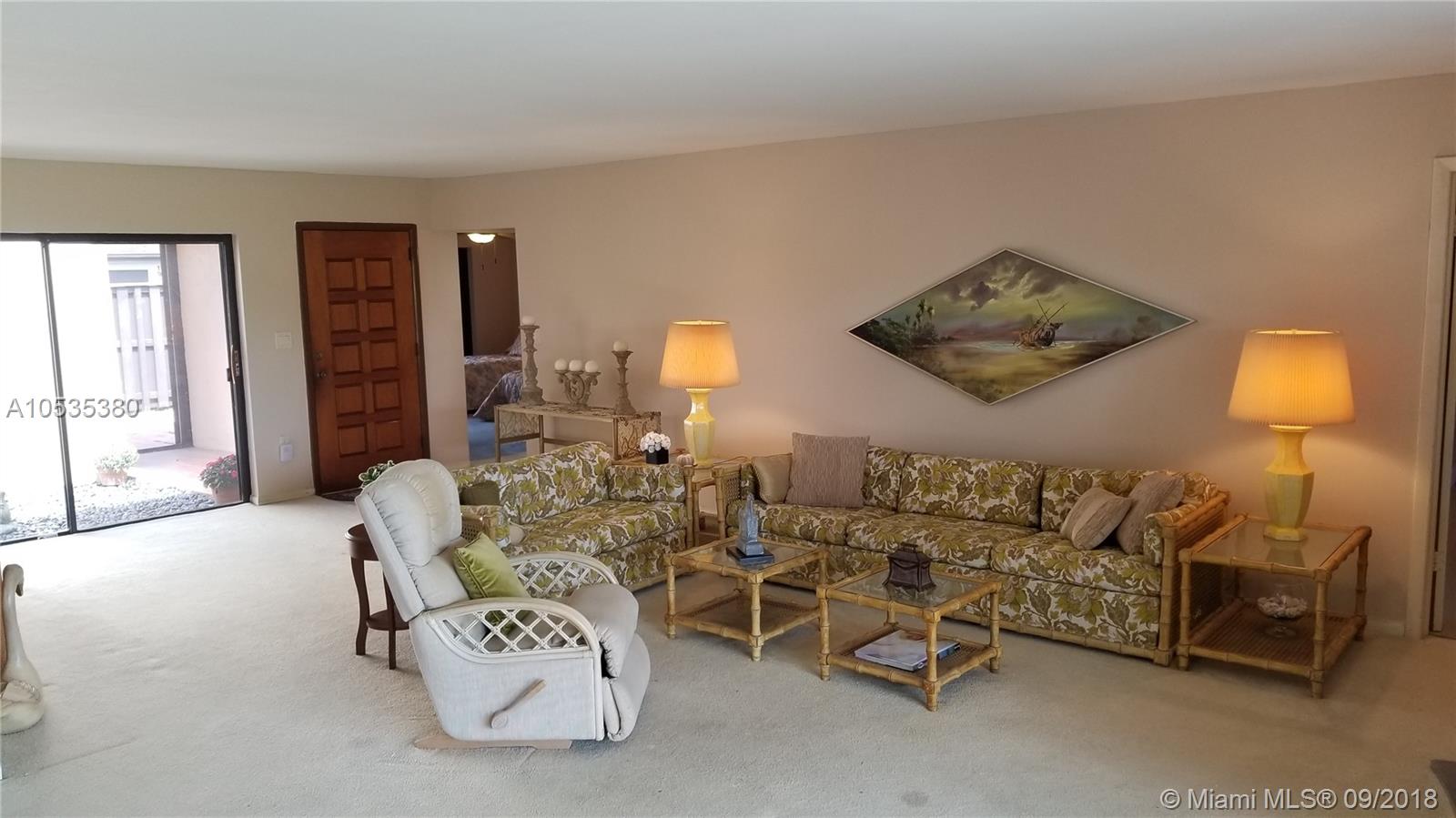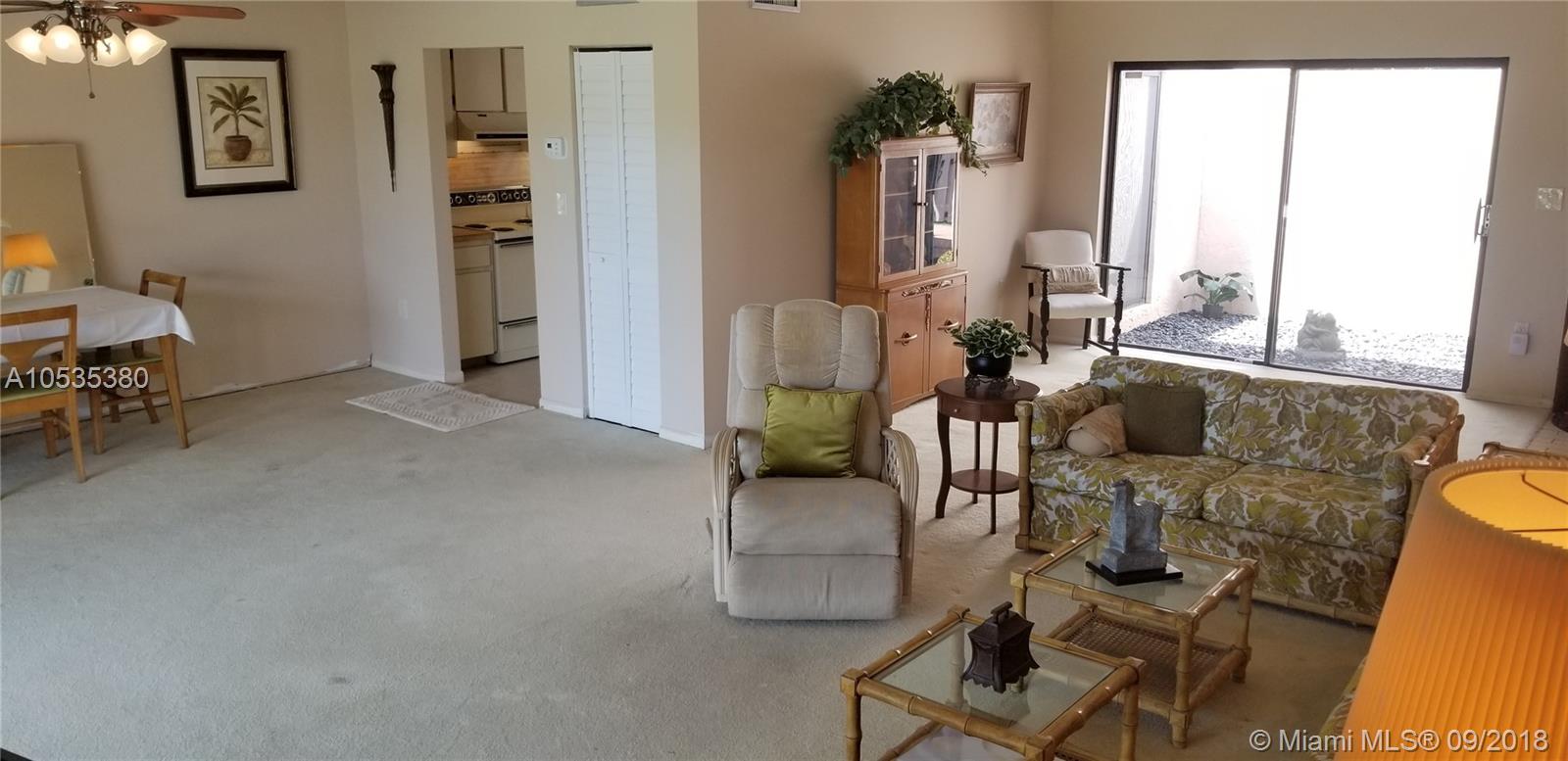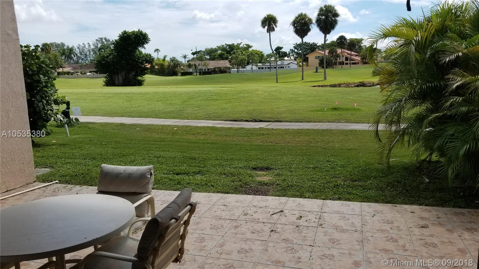 Big 1 story townhome on Golf Course, Country Club of Miami. Lush green spacious view. 2 large Bdrms/2 Bths, 2 car gar, corner unit. Master Bdrm & baths renovated, new vanities (dual sinks master Bth) shower, toilets, mirrors. 2 Central AC's, new electric panel. Replaced tile roofs & flat roof under warranty. New tankless water heater, gate & fencing, covered porch w/newly tiled floor. Dues only $200/YEAR! Kitchen & LR floor need updating.