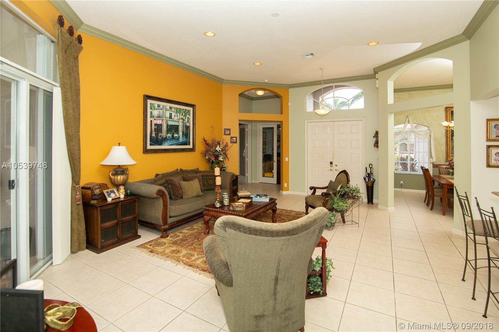 Beautiful One Story home located in the desirable gated community of Sunset Lakes/Miramar West, This elegant home features: 4 bedrooms, 3 baths, Den, with Bonus room offers an open floor plan, Kitchen with 42" cabinets, granite countertops, large Pantry, Butler Pantry with cabinets/ Wet Bar and Wine Cooler, formal living and dining room, crown moldings and high hat lights throughout, great Master Suite with a Sitting Area, walk in closet with large Master Bath, Family Room and Bonus Room with a nice view to the private and delightful landscaped, fenced heated pool/Jacuzzi, accordion shutters, Security Cameras and alarm. Circular Paved Driveway, only 40 homes at Las Brisas/Sunset Lakes. Featuring a Resort Style Clubhouse, Fitness center, 8 Tennis courts, Basketball, Pool, Kids Center.