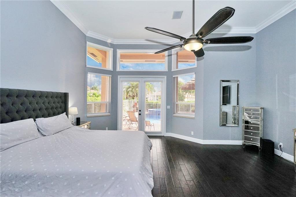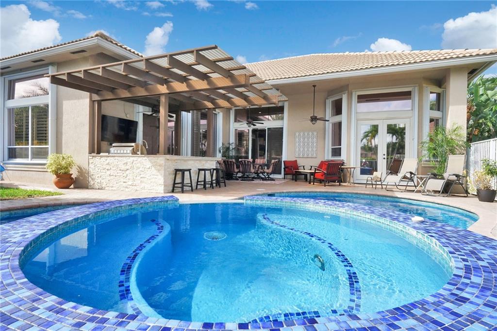 Upgraded more than most million $ homes! Almost $300k in custom hi-end design & finishes. Experience ultimate luxury & peace-of-mind living in this immaculately kept masterpiece! The $50k landscaping design immediately impresses w/ fountains & dramatic lighting! Hurricane impact glass front door reveals dramatic pool & water vistas, high ceilings & wide open spaces w/custom paint adorned w/crown moulding & wainscotting. The hand-scraped hardwood floors are to die for! Stunning kitchen w/waterfall quartz countertops, stainless appliances, double wall ovens++! Large master w/custom closets, $50k master bath remodel w/carrara marble & custom mosaic, secondary baths w/granite & marble, outdoor kitchen & pergola, remodeled pool w beautiful glass tile, salt-water system! Not a 10 ... an 11! Wow!