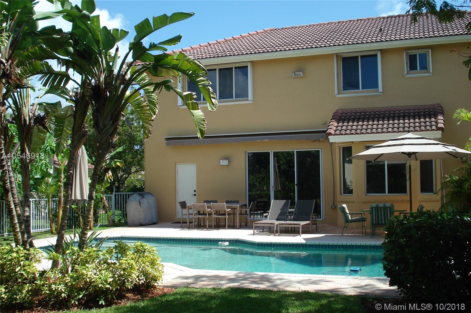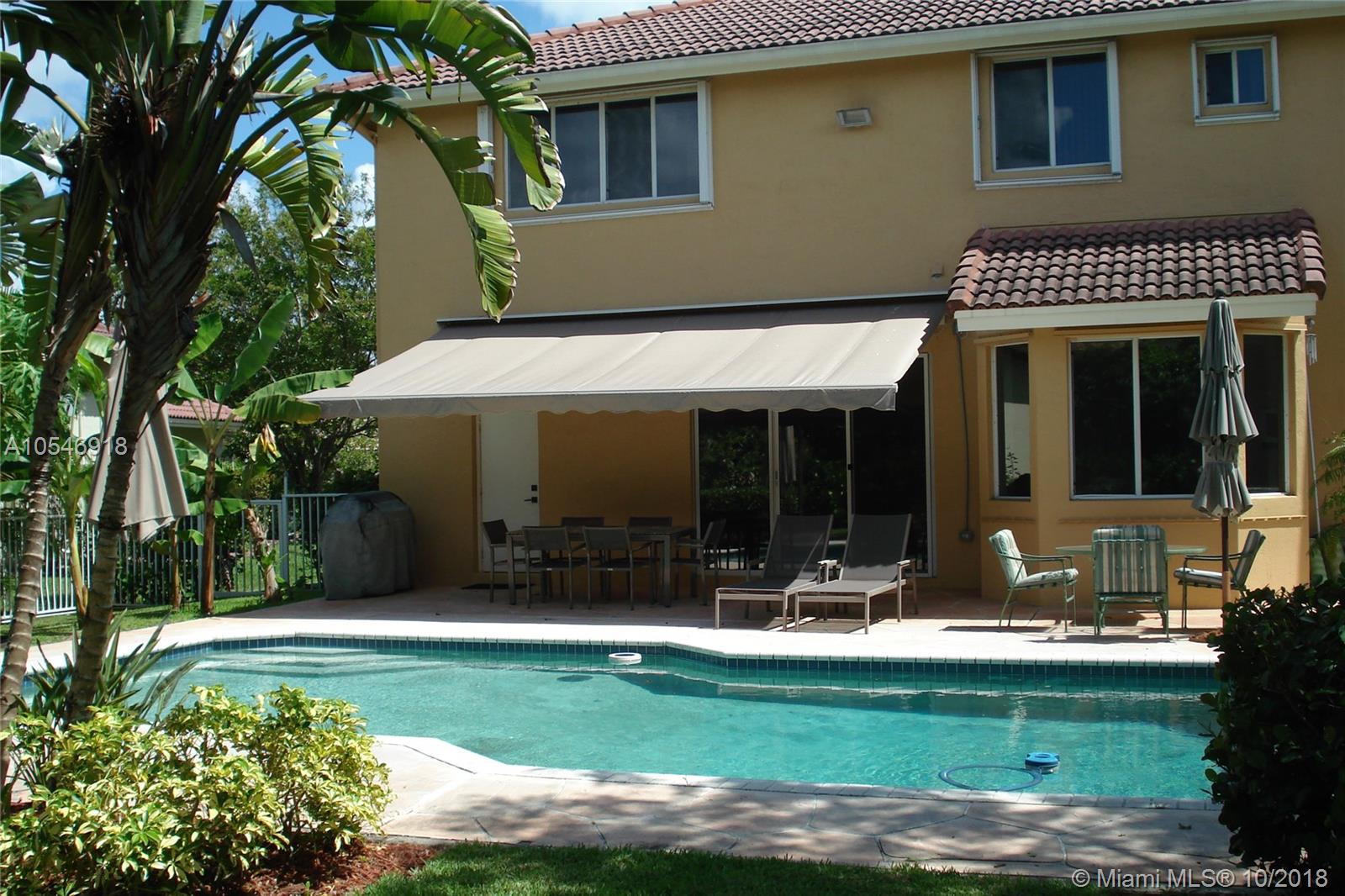 Beautifully maintained two-story home with 5 bedrooms, 4 full baths & 3-car garage. Double height ceiling in foyer opens to spacious and bright formal living, formal dining, family room & kitchen enjoying beautiful pool and garden views from every window. Eat-in kitchen, with appliances replaced within last 4 years features breakfast nook overlooking pool. One bed and full bath on first floor (tile floors) and 4 bedrooms and 3 full bathrooms on second floor. Spacious master bedroom with one walk-in closet & an additional full-size closet complete with a large bathroom & two separate vanity area, tub & shower stall. Washer dryer inside home. Attic for additional storage. Electrical retractable awning over pool terrace, ideal for entertaining. Fruit trees in yard.