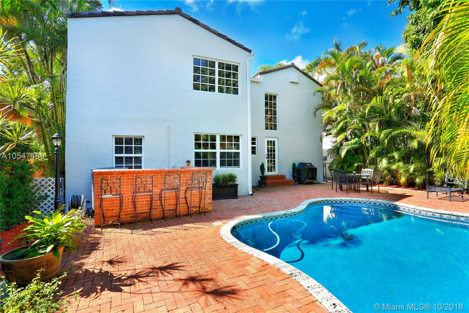 Rare opportunity to live in an Old Spanish house in the coveted South Gables! Light, bright, and updated, it features 3 bedrooms /2.5 bathrooms, 2,411 adjusted square feet, and a brand new roof! Formal living, dining, and family rooms all communicate creating a perfect place for entertaining or enjoying quiet time by the fireplace. Updated kitchen has a view of the pool and brick patio. Rare in a 1928 home is the gracious master suite with sitting area, modern bathroom and walk-in closet. 2 nicely-sized upstairs bedrooms open onto a sunny balcony and share a lovely bath. Partial impact glass, freshly painted, beautiful hardwood floors, and much more!
