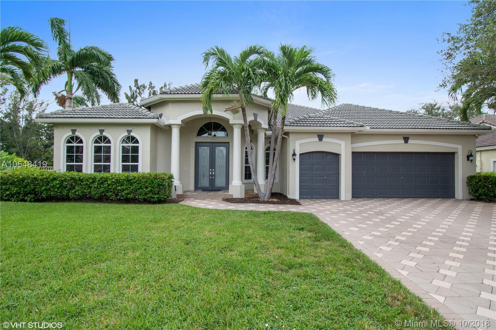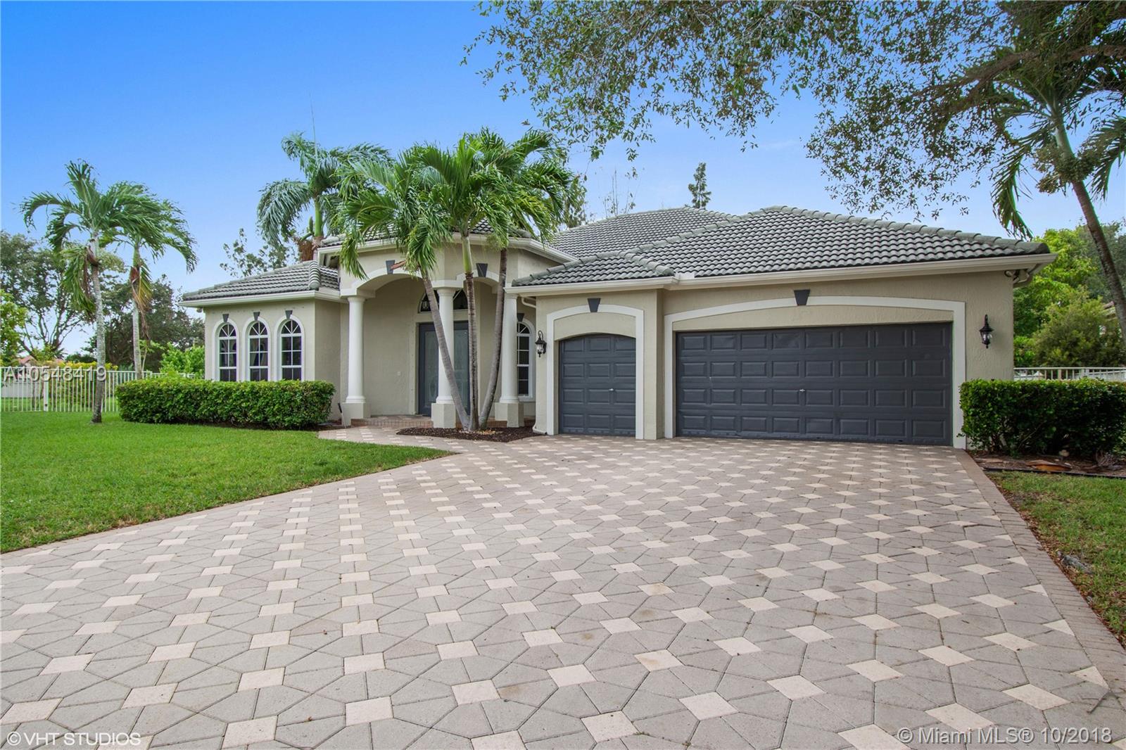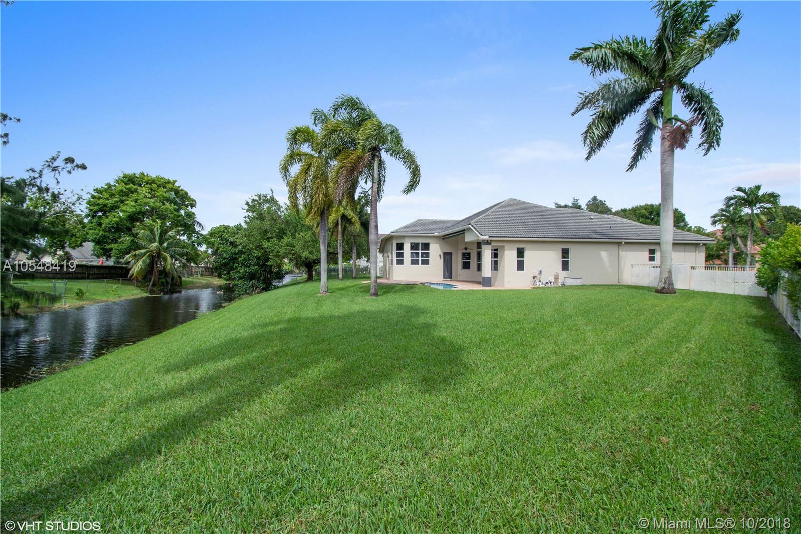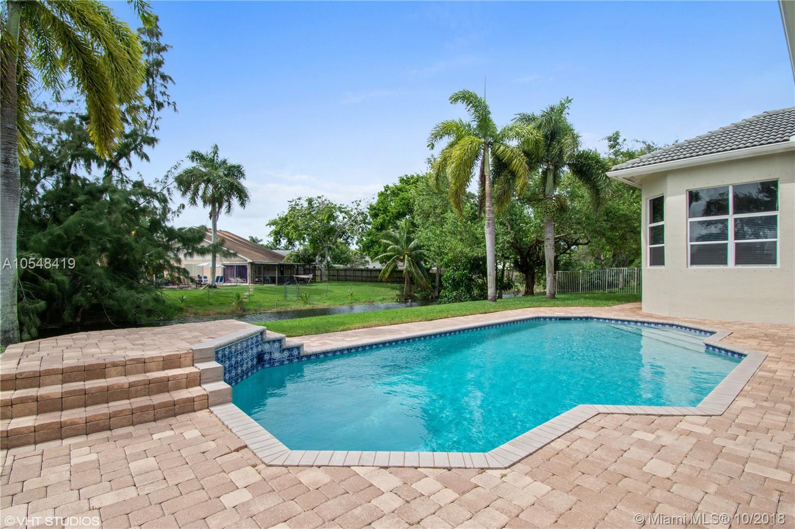 Second largest lot, pie-shaped, private with fenced backyard. 145' of canal-front. Desirable floor plan in prestigious gate-guarded, golf community, most conveniently located in Davie. 4-way 'split bdrms', pretty kitchen with new S/S appliances, double ovens, Maple cabinets, large pantry with pull-outs, center Island, Granite. Huge master bath with separate His/Hers vanities, double shower, Jacuzzi tub, His/Hers walk-in closets. Laminate in bedrooms. Dramatic 13' ceilings. Crown molding. New Washer/Dryer, A/C is 7 years, Water/Heater is 8 months. Freshly painted. Retractable awning. 2-car plus golf cart garage and 3-car wide driveway. 12,000sf lot w/additional 3,000 of slope to canal. Hurricane protection. Low HOA include: basic cable, alarm, internet & 24/7 gate-guarded. Top rated schools