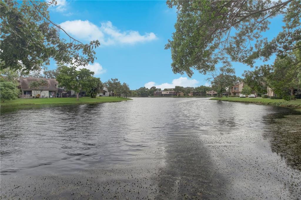 Spacious townhome in the heart of desirable Plantation! Tranquil lake views from your kitchen and large patio, with plenty of green space. This unit has a large living room & separate dining area overlooking patio and lake. Kitchen features large breakfast bar and newer appliances. Downstairs has huge pantry, laundry room and 1/2 bath for guests. Upstairs has two masters, with new carpeting, updated white bathrooms and two large walk-in closets. Back bedroom also has lake views! This small complex allows pets and can be rented after one year so also good for investors. The pool, clubhouse and tennis courts are a short walk & great for entertaining. This is the best priced townhome in the complex so will not last. Property is near, restaurants, shops & across from Central Park!